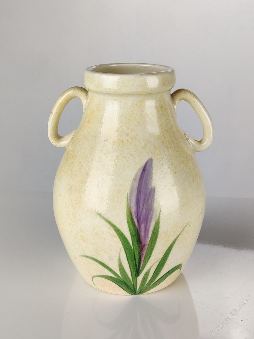 A rare hand painted Art Deco Radford vase depicting irises in purple and yellow. In good condition, it is a lovely vase that would make addition to a collection or great gift for someone special.Dimensions: