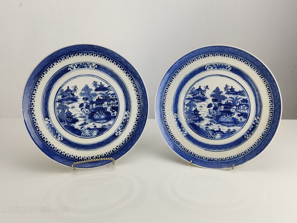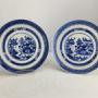 A pair of late 18th century Chinese Nanking export blue and white shallow bowls of excellent quality. The pattern is a wonderful detailed version of a teahouse, estuary and landscape. Small nibble with hairline to one bowl, the other is in perfect condition. (See photos). Some irregularities to the glaze.Circa 1790's