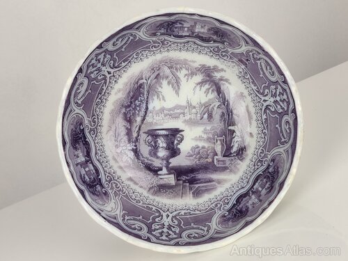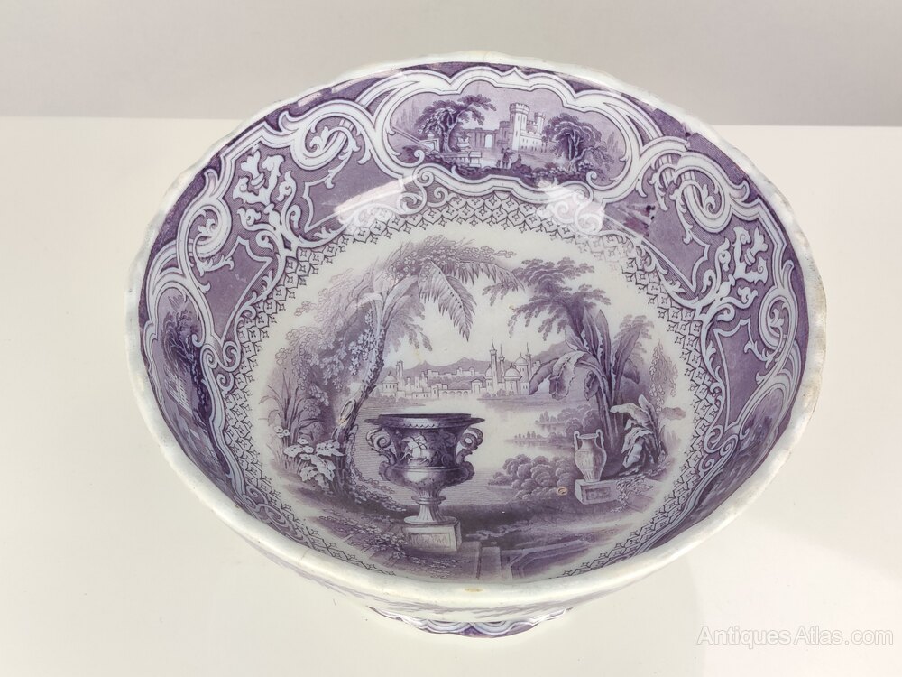 A really nice rare 19th Century Scottish Pottery Punch Bowl/Planter. With fluted edges to the top and base, the transfer pattern shows various scenes amongst an intricate pattern. There are a couple of slight old hairline cracks to the top edge, and some crazing and scuffing to internal glaze, but no chips or breaks and in lovely overall condition for its age.Dimensions: