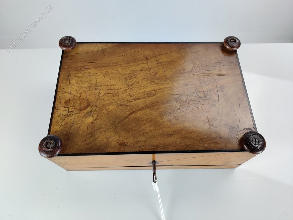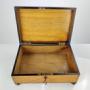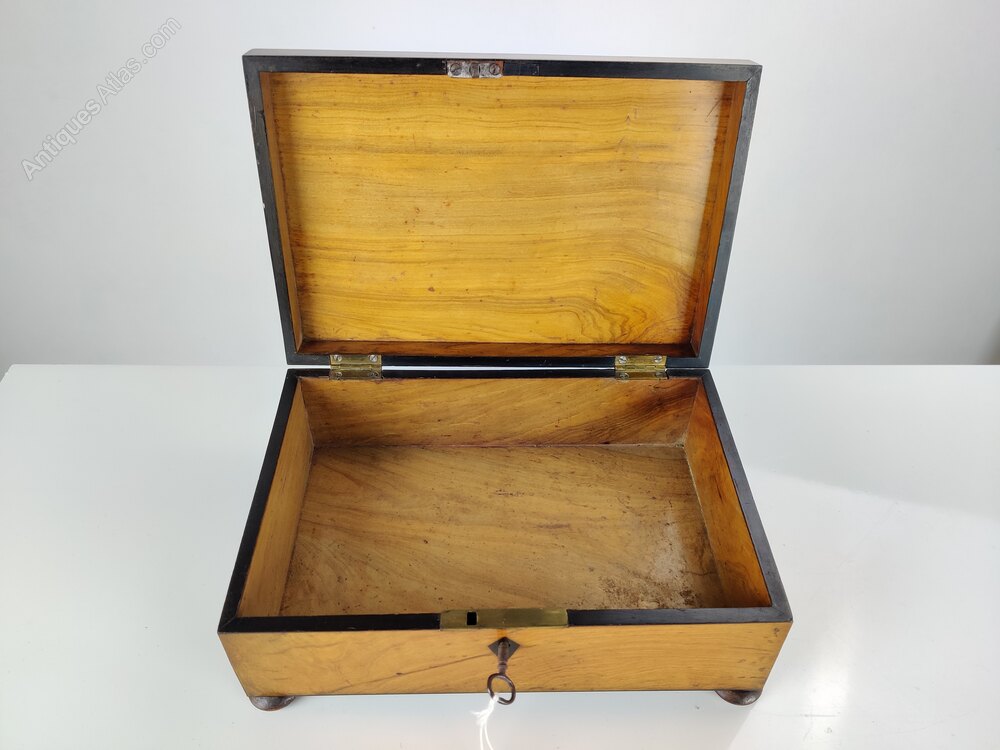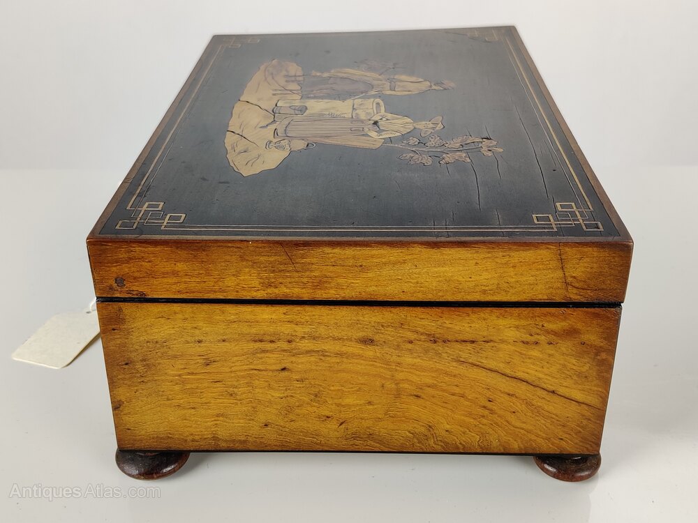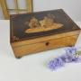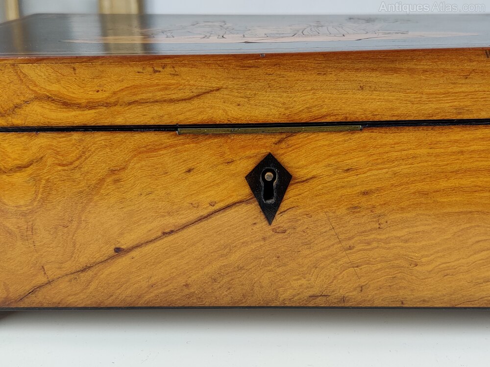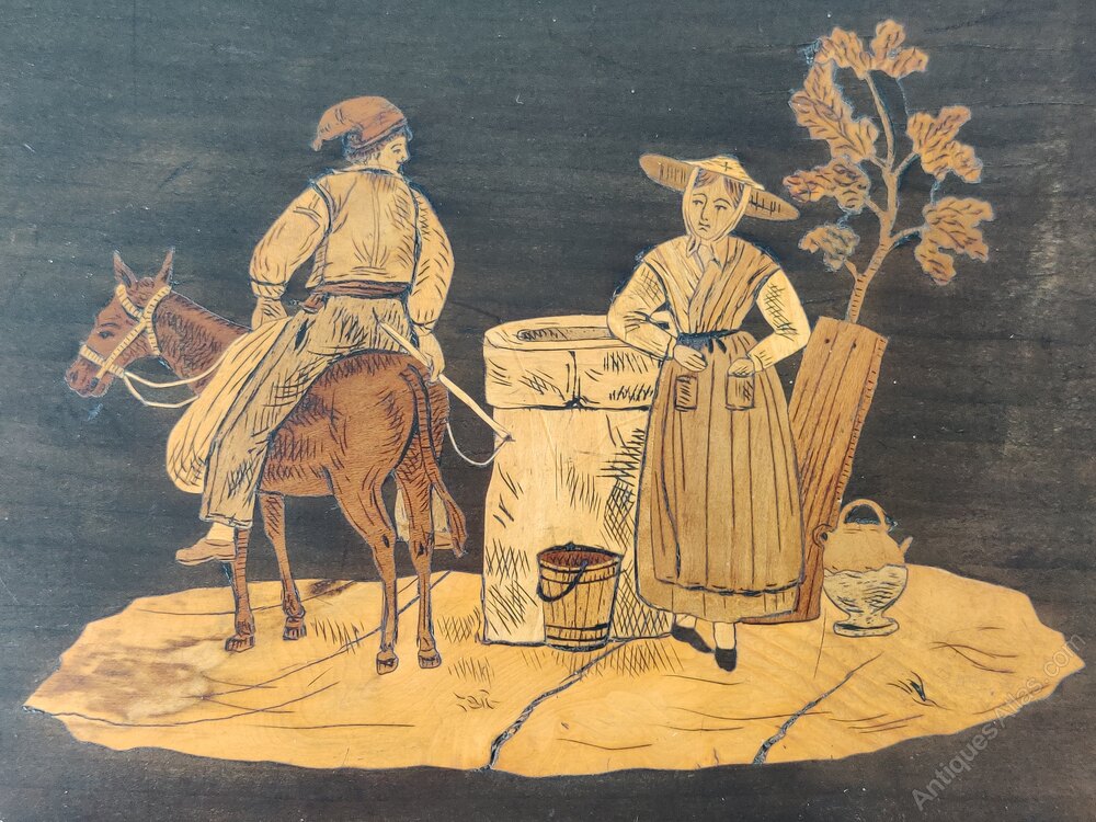 A beautiful example of an early to mid 19th century Sorrento ware box from Italy, made from solid olive wood. This is an early piece and handmade not to be confused with later more modern boxes.This incredible box is in good condition with a key. The figurative group on the top is a mixture of inlaid woods including beautiful green Harewood making up the figures onto solid olive wood. This box would make a wonderful jewellery box.