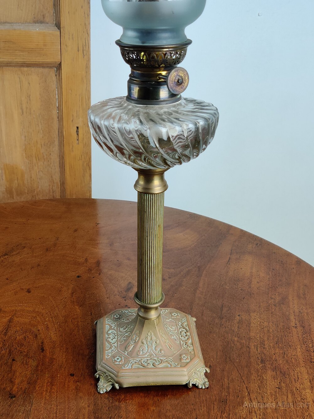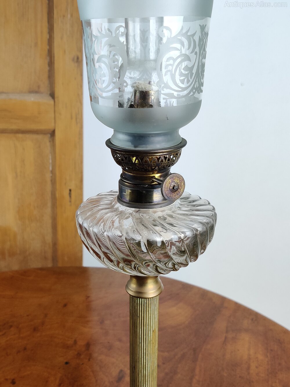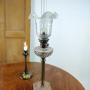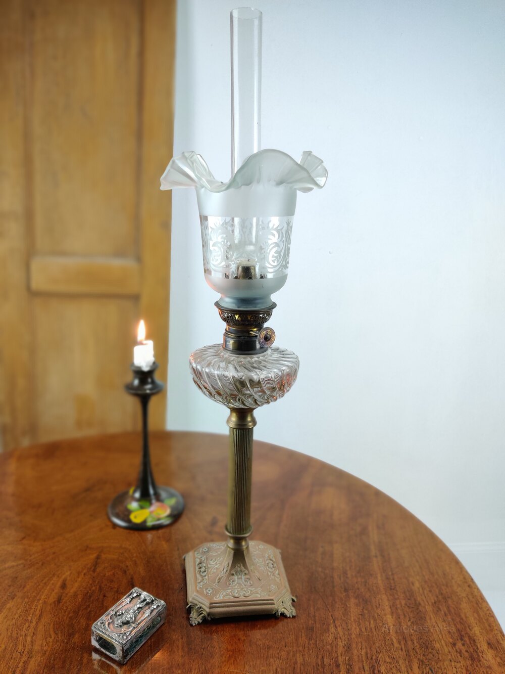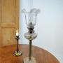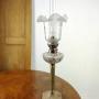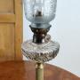 A lovely French glass oil lamp/ peg lamp with original shade and chimney. Single burner on a brass base, this oil lamp is in good condition and made from clear glass with no damage. This lamp would fit nicely anywhere in the house. Great for a power cut or creating ambience.Late 19th Century