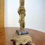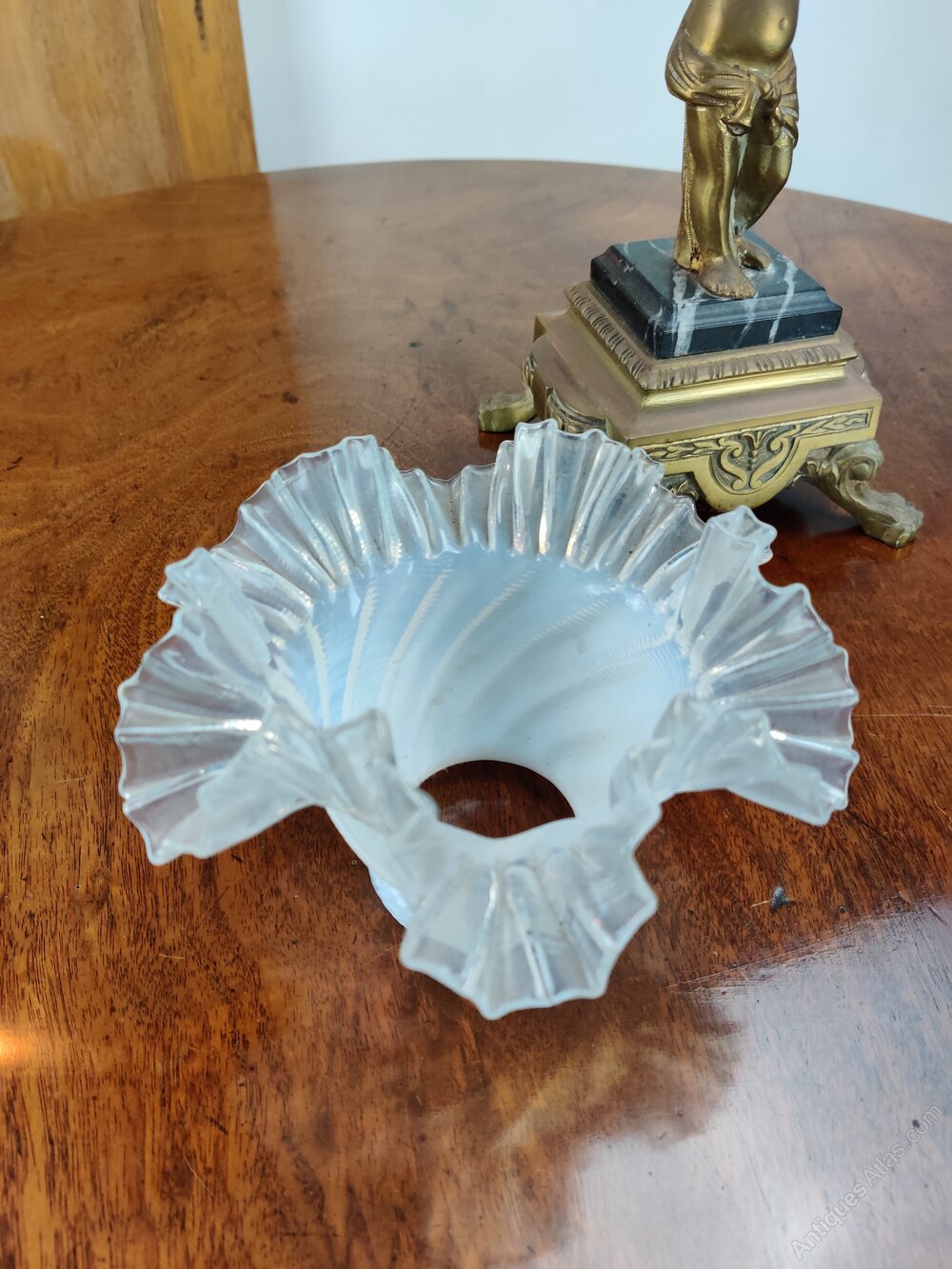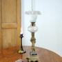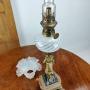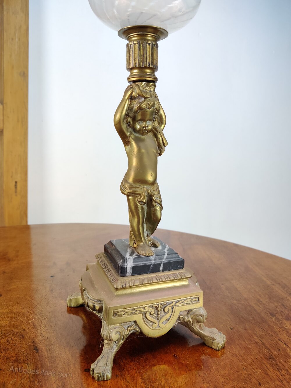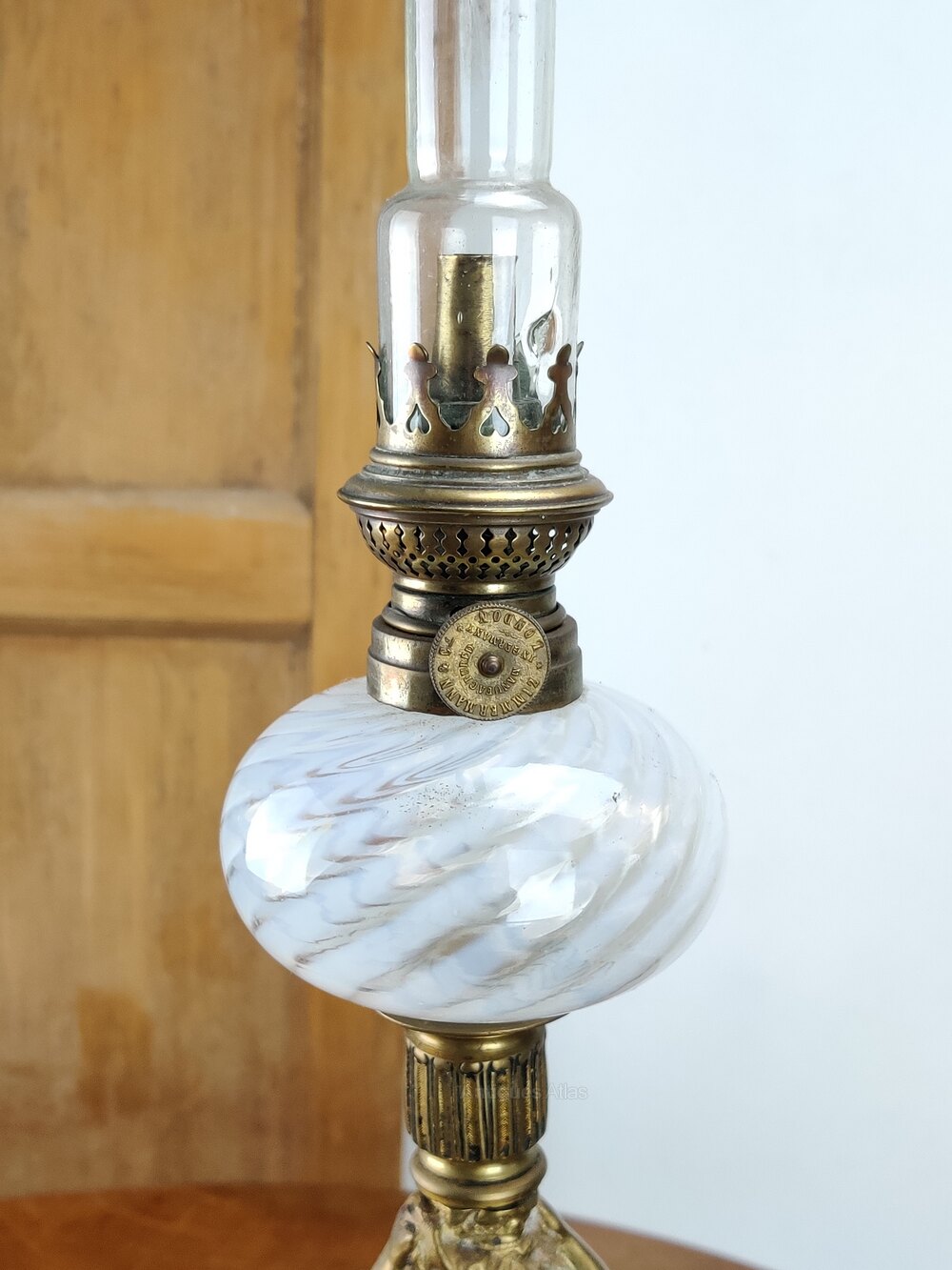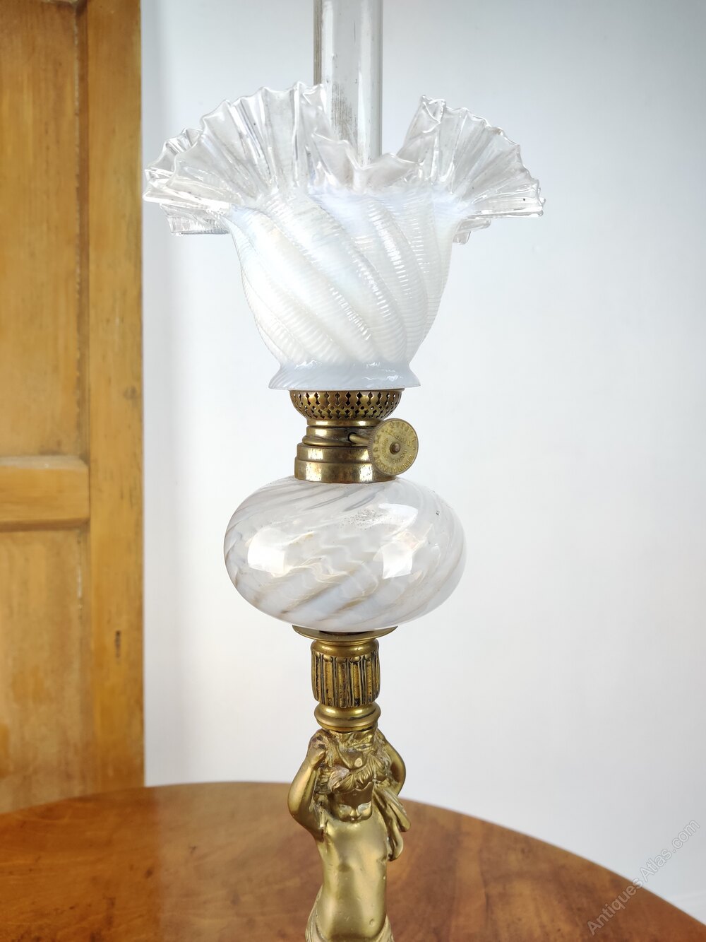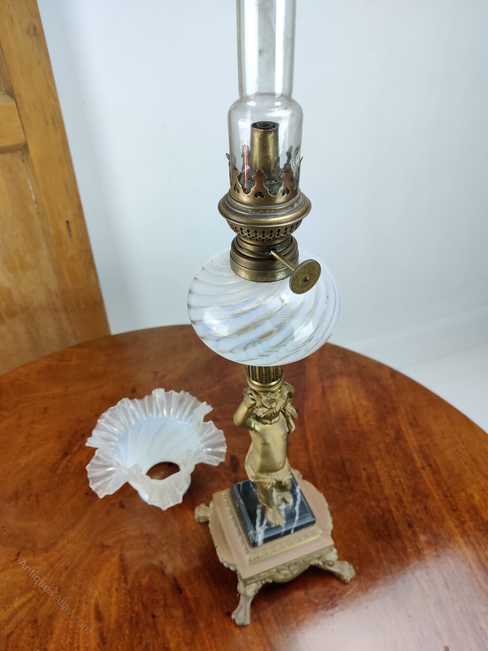 A lovely French oil lamp/ peg lamp with opaline shade, font and clear glass chimney. Single burner on a brass and marble base with cherub. This oil lamp is in nice condition and would fit nicely anywhere around the home.Late 19th Century Circa 1880's