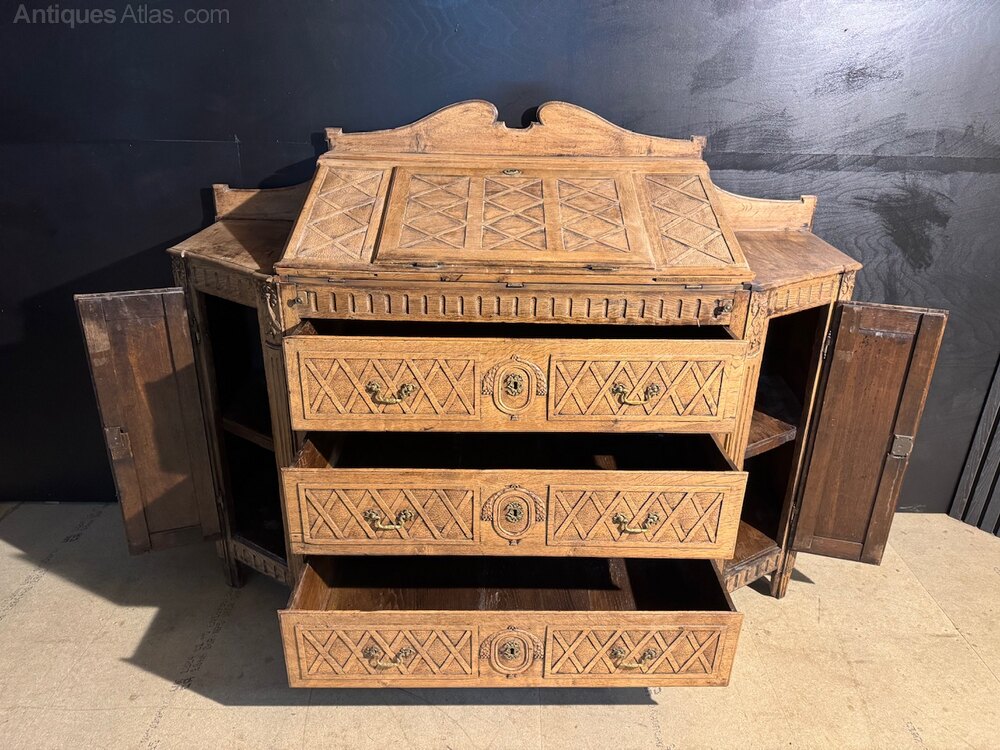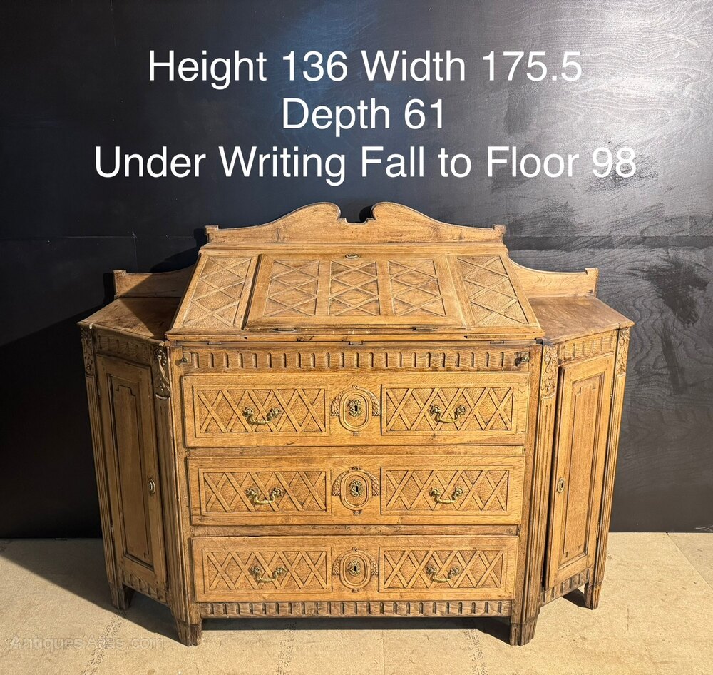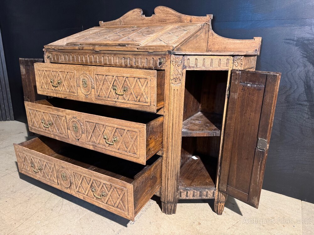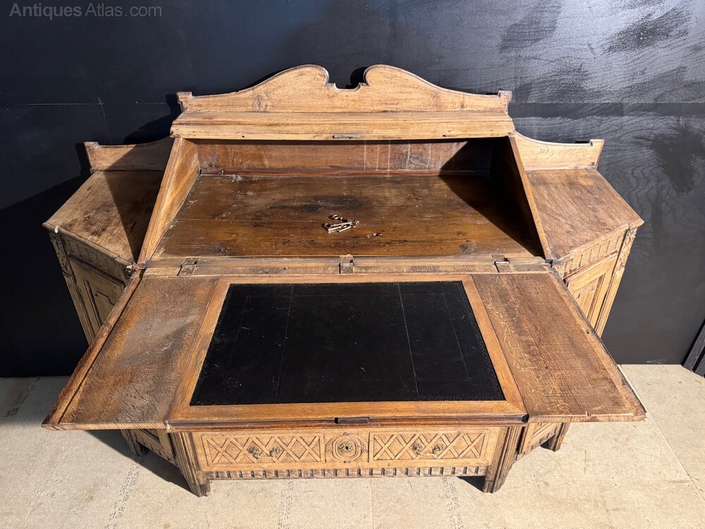 A rare piece of furniture that came from a Convent in France, the top half is a desk with large flap that drops over into lugs that pull out, inside a leather writing surface. Underneath 3 large deep drawers and either side. Cupboard. Made from Oak and dating to the 18th Century. In overall very good condition for its age. Height 136 cm Width 175.5 cm Depth 61 cm Under Writing Fall to Floor 98The prices include FREE delivery to the south east of England, the rest of England and Wales is usually £65 to £125 depending on size of the item, the far north and Southern Scotland a little more, elsewhere please enquire, for large items slightly more may apply also very good rates to Ireland or worldwide. London is £65 to £125 Please feel free to contact us to discuss this item either by email or phone.