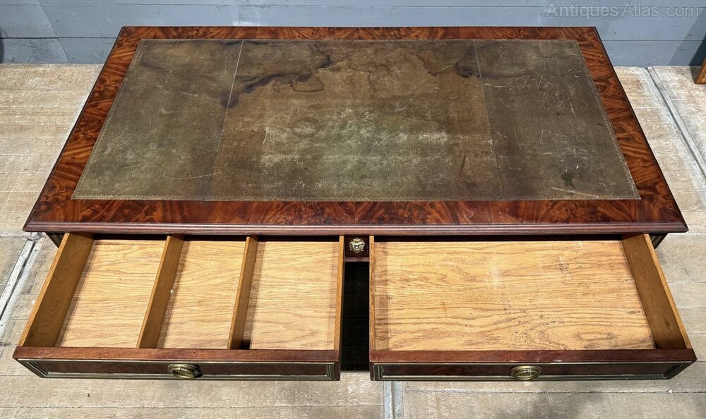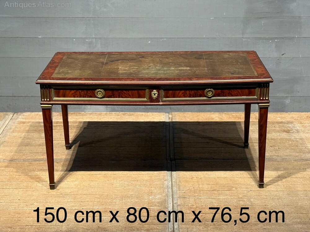 A beautiful French Louis XVI Writing Table or Desk, from a house in the Paris outskirts. Of high quality construction using lovely flamed mahogany and brass detailing. The 2 drawers run smoothly, it retains its original leather top which has lots of character but you could replace for a new leather. In overall very good original condition.Width 150 cm