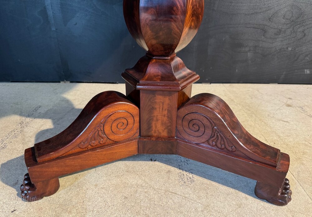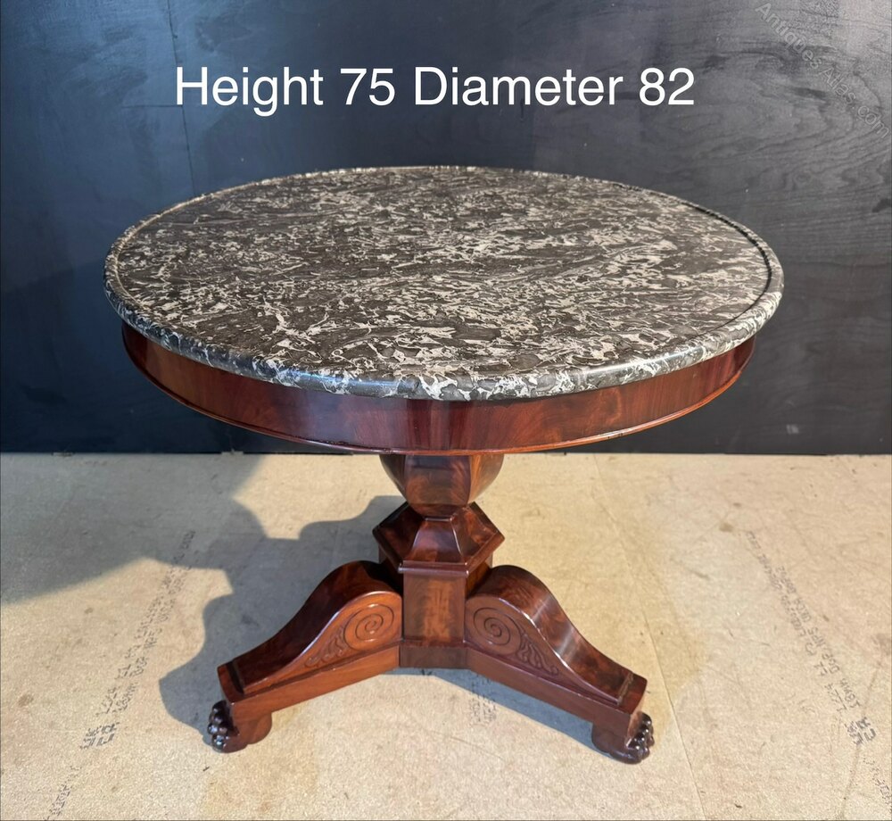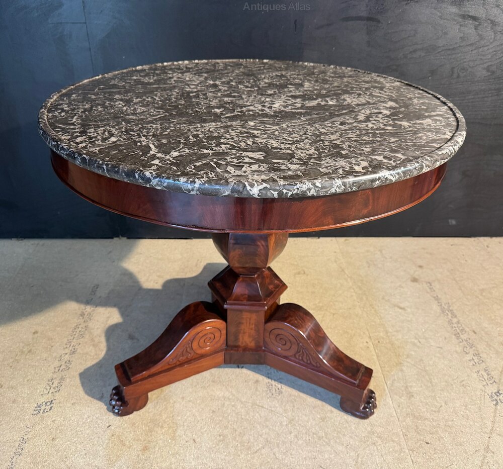 A lovely French Gueridon Centre Table, dating to the early 19th Century, the base made of Mahogany and its original grey variegated Marble top with a groove towards the edge. We have re French Polished the base so in excellent condition for the home.Height 75 cm