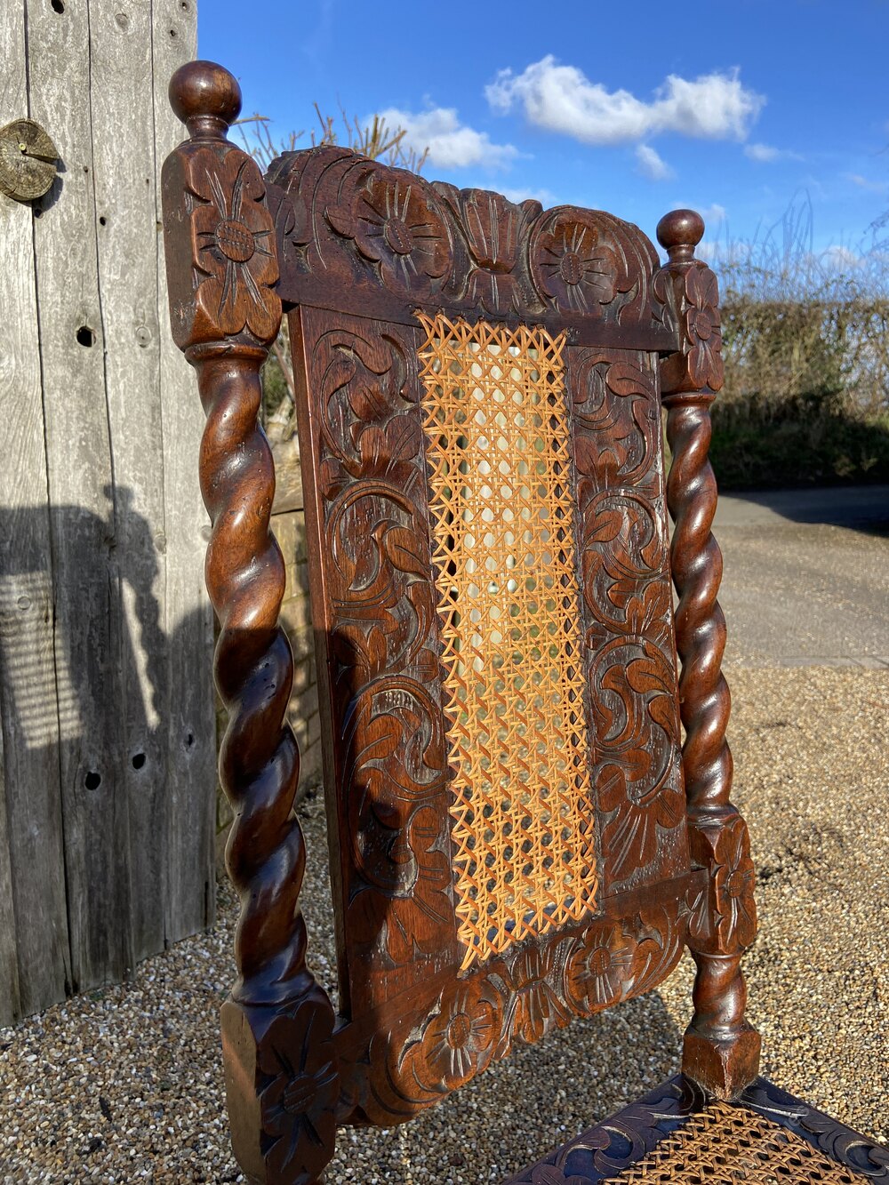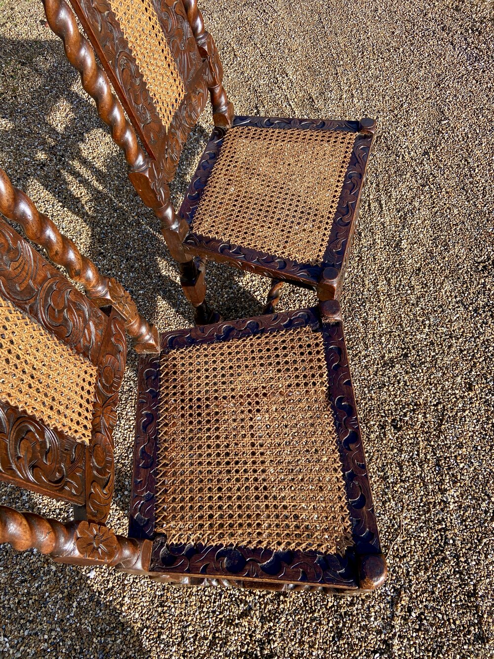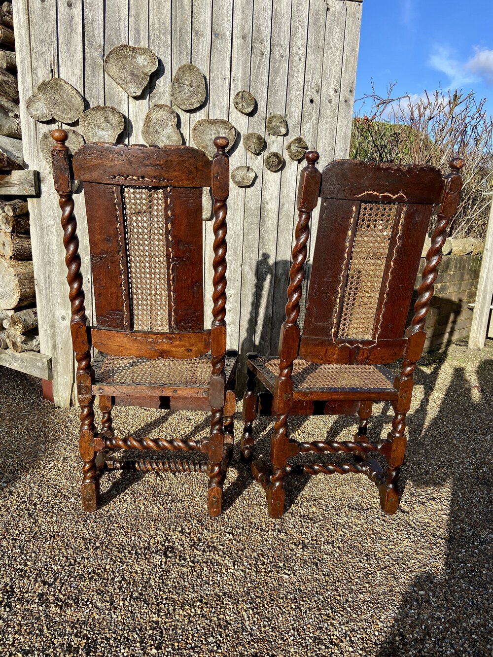 Lovely pair of 17th century walnut chairs with lovely patina and colour and usual repairs and restorations. Sears and backs are of cane which is in good condition and the carving is very attractive.Date17th Century