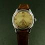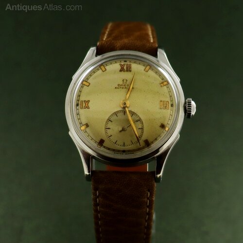 1930s Omega bumper-automatic, steel case — Model 2375. Features a rare gilt Roman-numeral dial with subsidiary seconds. Dial signed “Omega” and preserved in very good original condition. Omega cal. 28.10, 17 jewels, movement signed and numbered by Omega.Case size 32.5 mm excl button. lug to lug 39.7mm. Strap width 17mm.