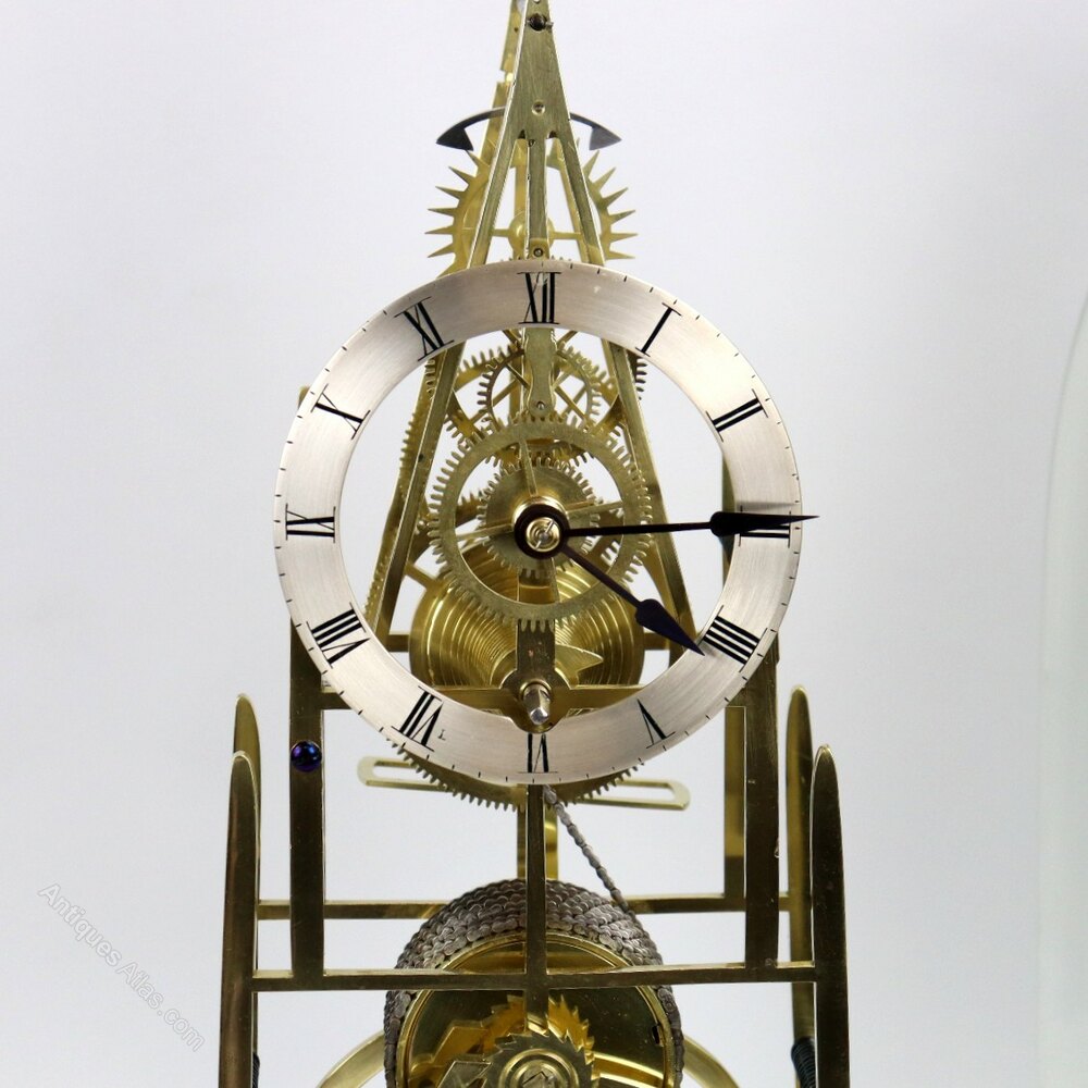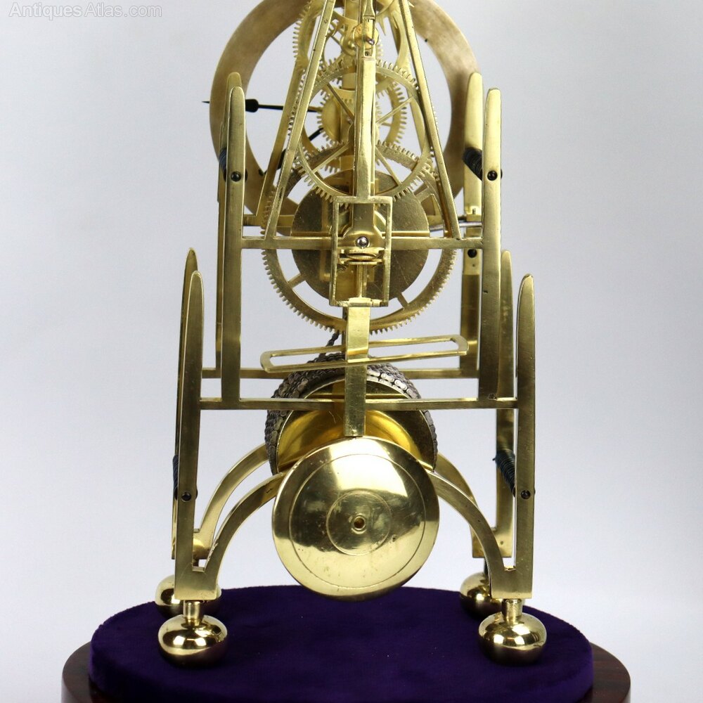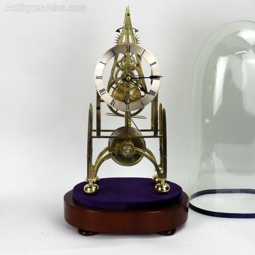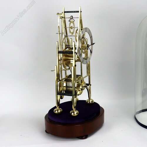 An elegant English skeleton timepiece dating to the mid-19th century, featuring a finely constructed single fusee movement with chain fusee. The silvered chapter ring is engraved with Roman numerals, complementing the openworked design that showcases the movement’s craftsmanship. The clock is presented on a Mahogany base, adding warmth and contrast to the refined mechanical form.
