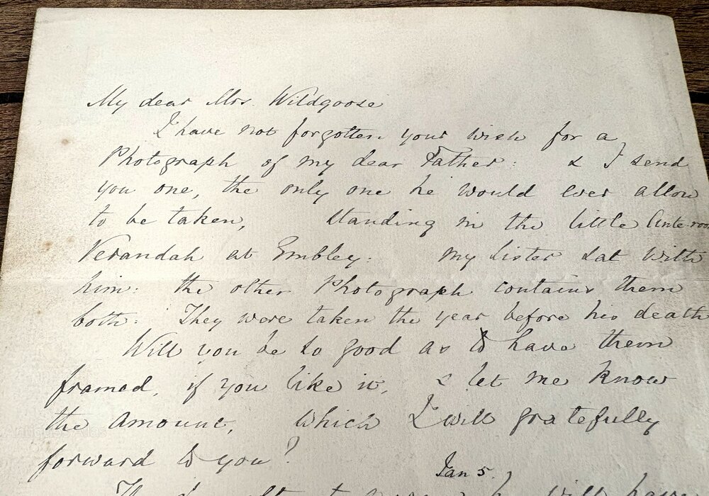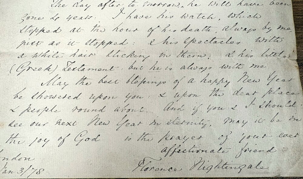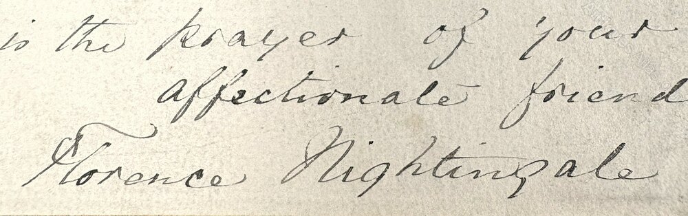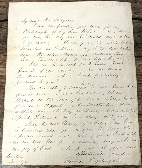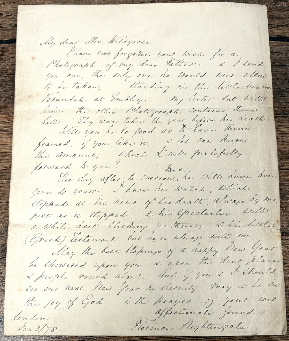 Here we have a rare surviving piece of history in the form of an original signed letter by Florence Nightingale OM LGStJ (1820-1910)The affectionate and touching autograph letter in ink, written one side of a folded double sheet 8 x 10in (20.3 x 25.4cm) laid paper dated January 3rd 1878 from Florence Nightingale, London, to Mrs. Wildgoose: My dear Mrs. Wildgoose, I have not forgotten your wish for a Photograph of my dear father: & I send you one, the only one he would ever allow to be taken, standing in the little Ante-room Verandah at Embley. My sister sat with him. the other photograph contains them both. They were taken in the year before her death. Will you be so good as to Have them framed if you would like it, & let me know the amount, which I will gratefully forward to you. The day after tomorrow /Jan 5 he will have been gone 4 years. I have his watch, which stopped at the hour of his death, always by me, just as it stopped: & his spectacles with a white hair sticking in them & his little(Greek) Testament: but he is always with me. May the best blessings of a happy New Year be showered upon you: & upon the dear place & people round about. And if you and I should See our next New Year in eternity, may it be in the joy of God – is the prayer of your ever affectionate friend [signed] Florence Nightingale London Jan 3/78