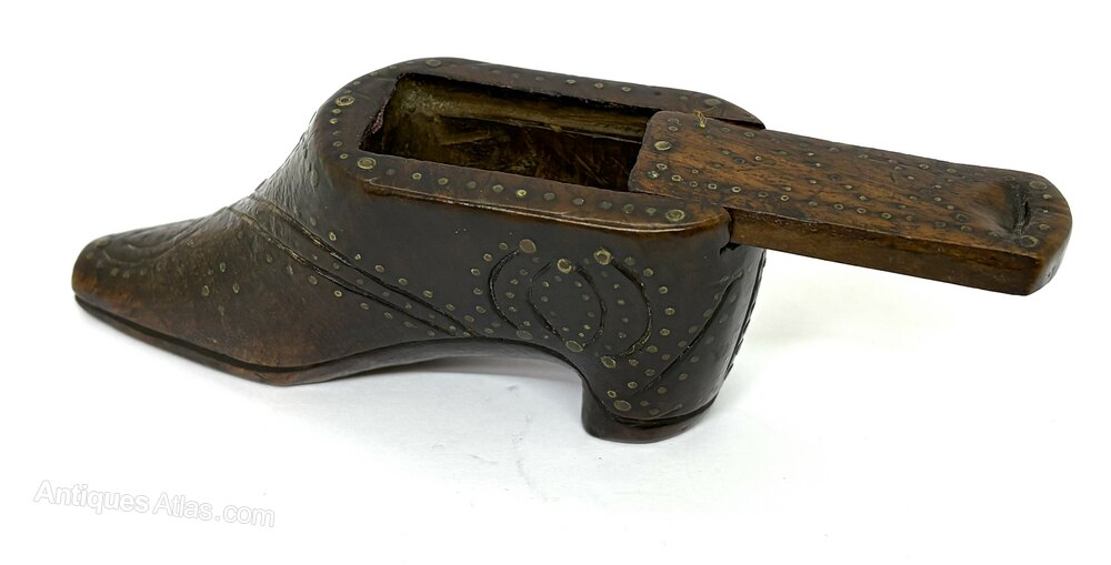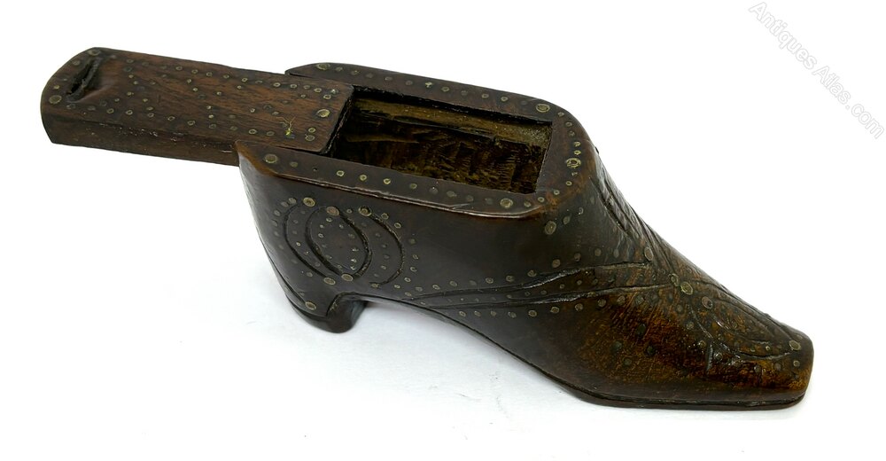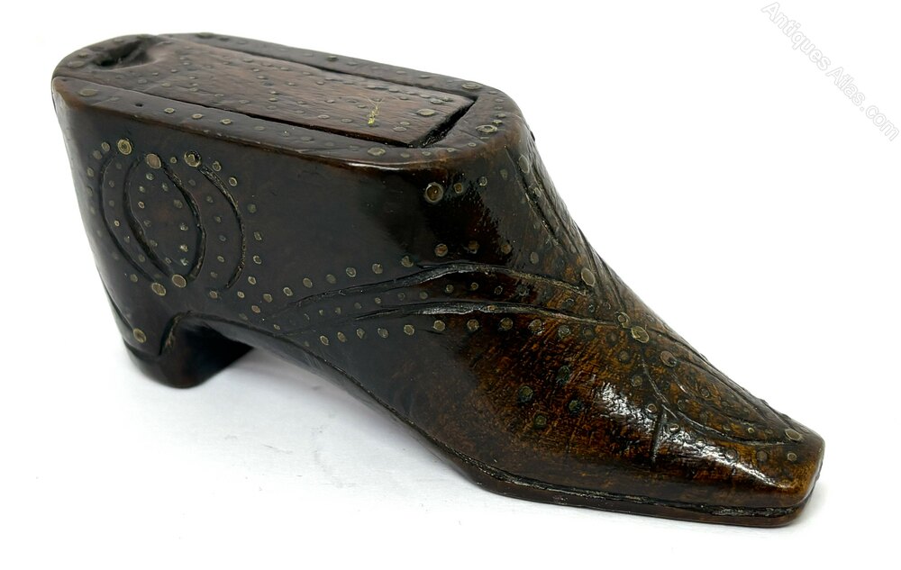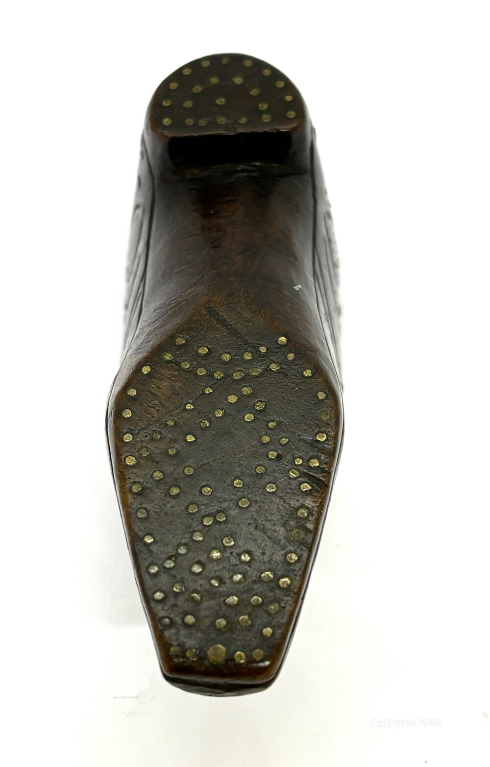 Here we have a really good quality antique treen snuff box modelled as a ladies shoe with a sliding top and brass tack pique work to the front, sides and base.Size: 95 x 40mm