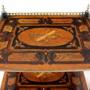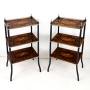 A stylish pair of French marquetry inlaid étagères dating to circa 1860. Each with three shelves featuring intricate marquetry in walnut, boxwood and ebonised inlays depicting musical instruments, scrolls and flowers within a cartouche border and united by ebonised outsplayed supports, with original brass three quarter gallery with finials to the supports and brass edge mouldings to all shelves. This lovely pair of étagères could be used as side tables against a wall or either side of a settee but can also be used completely free standing.In good condition for age, some fading and water marks more to the top shelves but still very attractive and versatile pieces of furniture.