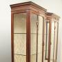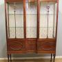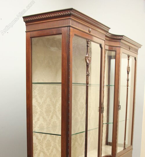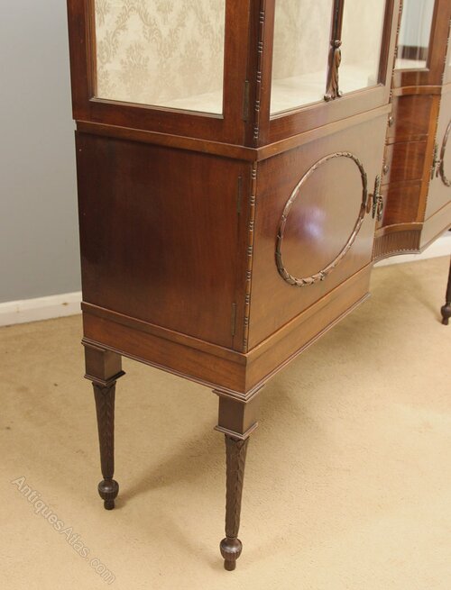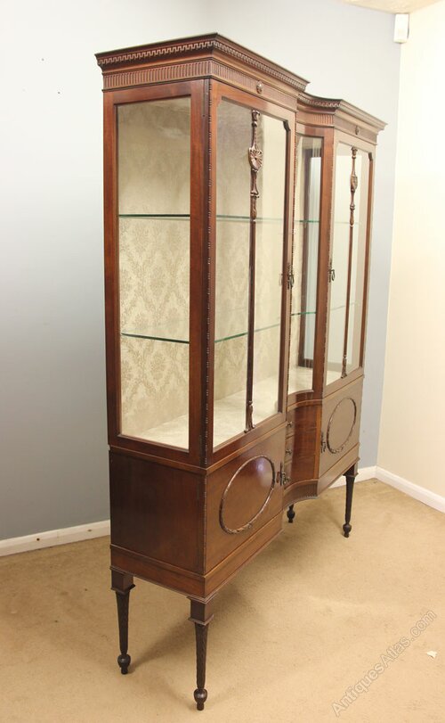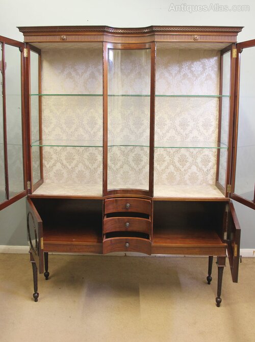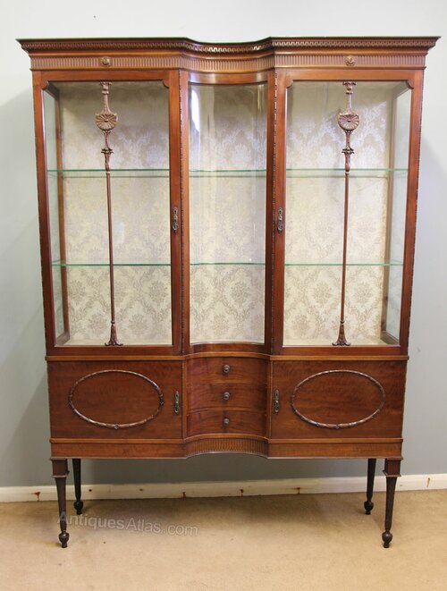 Antique Edwardian Mahogany Display Cabinet, This antique Edwardian mahogany shaped front glass display cabinet, The cornice having a Greek key moulding with decoration under, This cabinet has two glazed doors with a shaped concave glass panel to the centre under having cupboard either side with three shaped drawers to the centre all supported by turned and carved legs,-