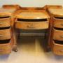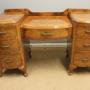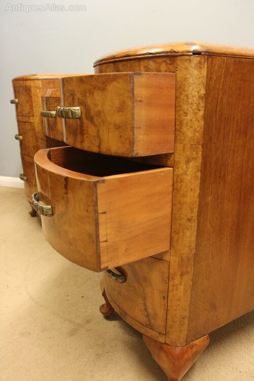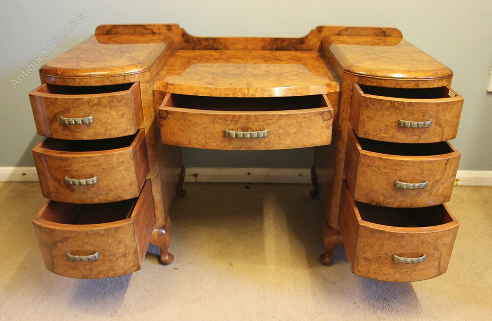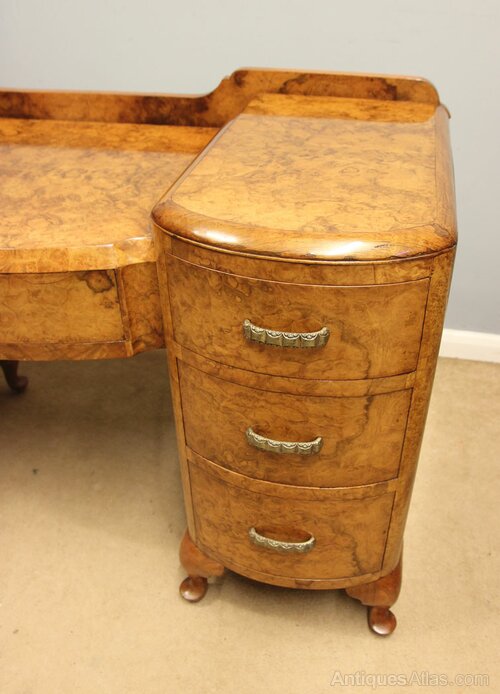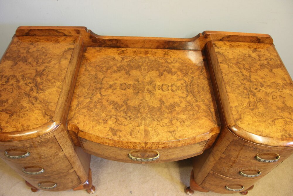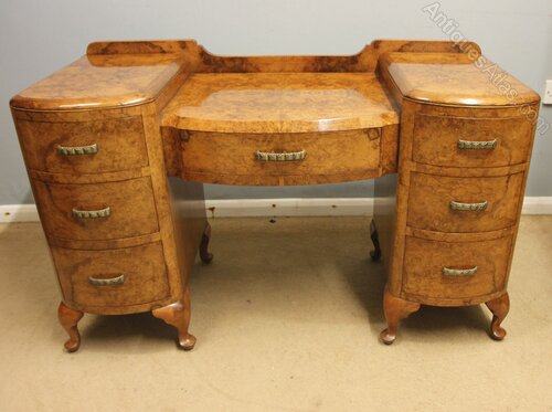 Antique Burr Walnut Art Deco Style Dressing Table. This wonderful burr walnut shaped dressing table has a small shaped upstand to the back Having a lovely bow front centre drawer with figured burr walnut top with moulded edge flanked either side by three bow front shaped drawers all with lovely figured walnut drawer fronts and all fitted with decorative brass handles. all stands on short queen anne style legs.-
