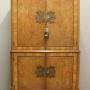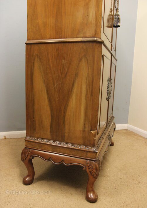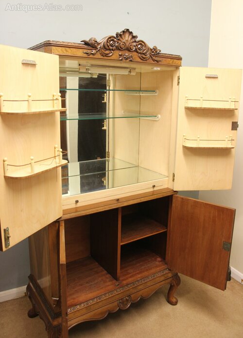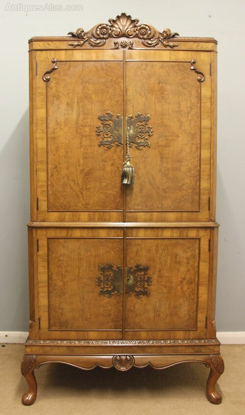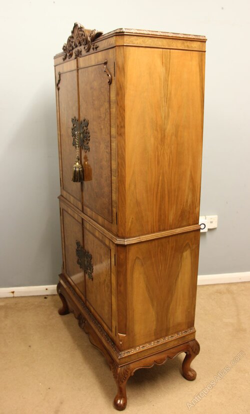 Antique Walnut Cocktail Drinks Cabinet. This lovely walnut cocktail drinks cabinet in the queen anne style has a shaped top with wonderful carved and scroll detail to the centre with a carved detail edge. Under having two walnut door fronts with walnut cross banded edge and scroll applied mouldings with a lovely ornate brass back plate. The interior has a mirrored back with two glass shelves and a mirrored bottom. The bottom section has two burr walnut door fronts with applied moulding with walnut cross banded edge and decorative brass back plate. The interior having storage space and single shelf to the righthand side. All supported by a shaped walnut frieze with carved detail to the centre and short carved cabriole style legs. The cocktail cabinet comes into two pieces for easy transportation.-