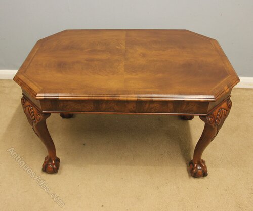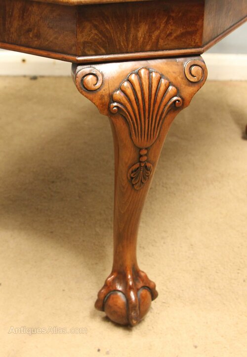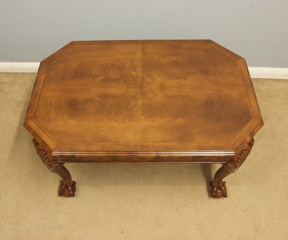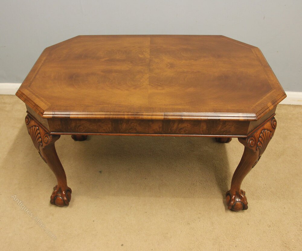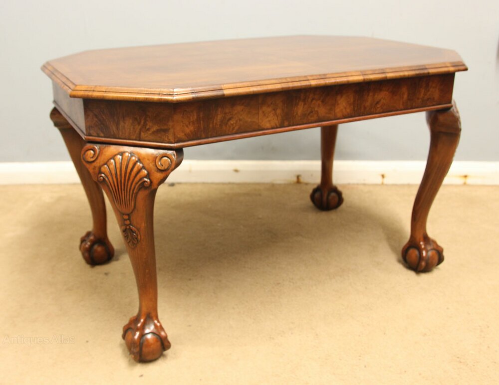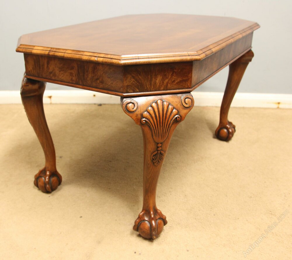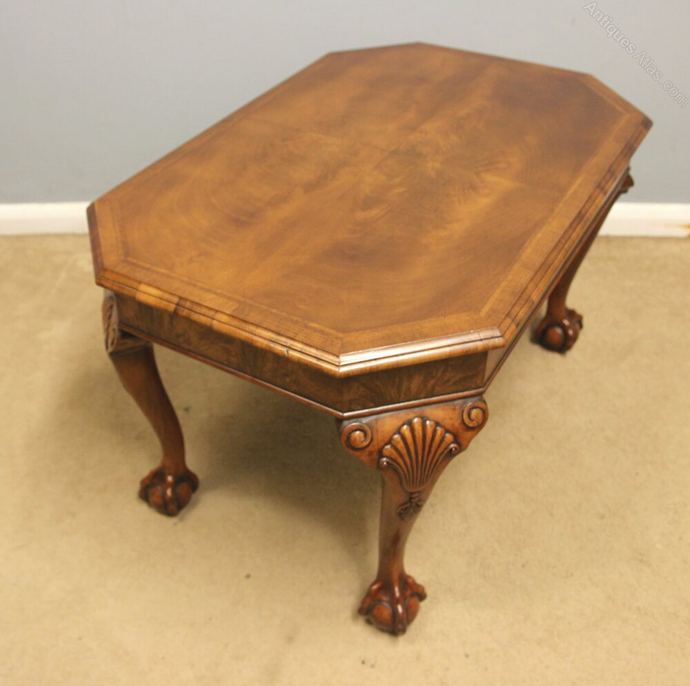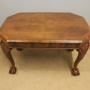 Antique Walnut Coffee Table, This quality walnut coffee / occasional table has a figured walnut top with a crossbanded edge with walnut skirt under, All supported by queen anne style legs with carved shell and ball and claw feet,-