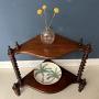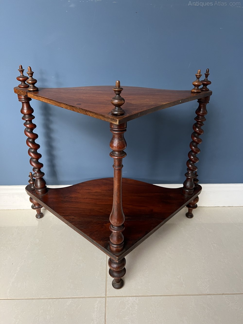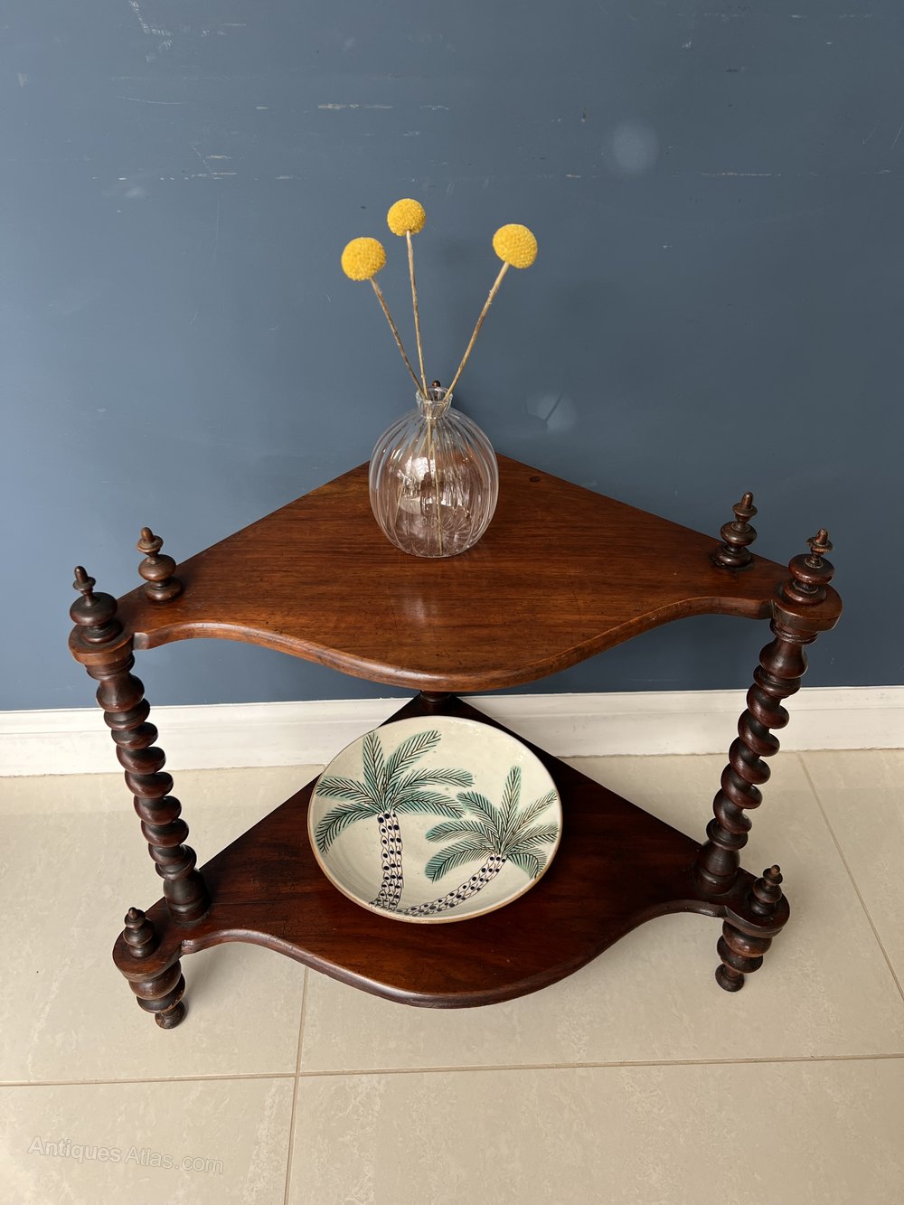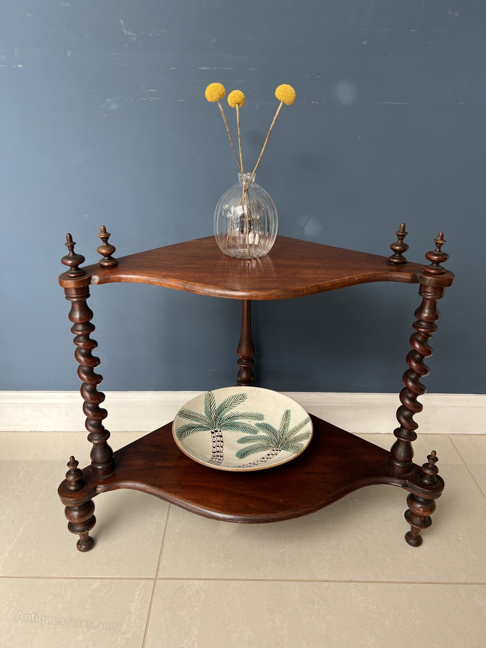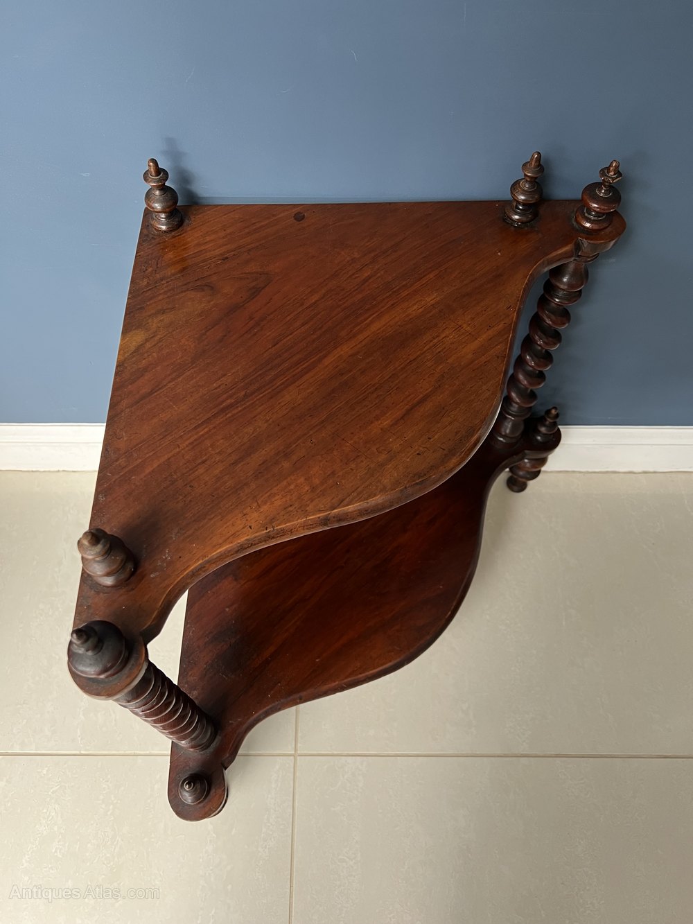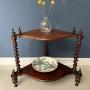 A really attractive and versatile two tier corner étagère or Victorian shelving unit. The compact proportions of this table mean that it could also be placed next to an armchair or sofa as a useful side table. The two shelves have a curved leading edge and are supported by two barley twist columns, all sitting on three turned feet.