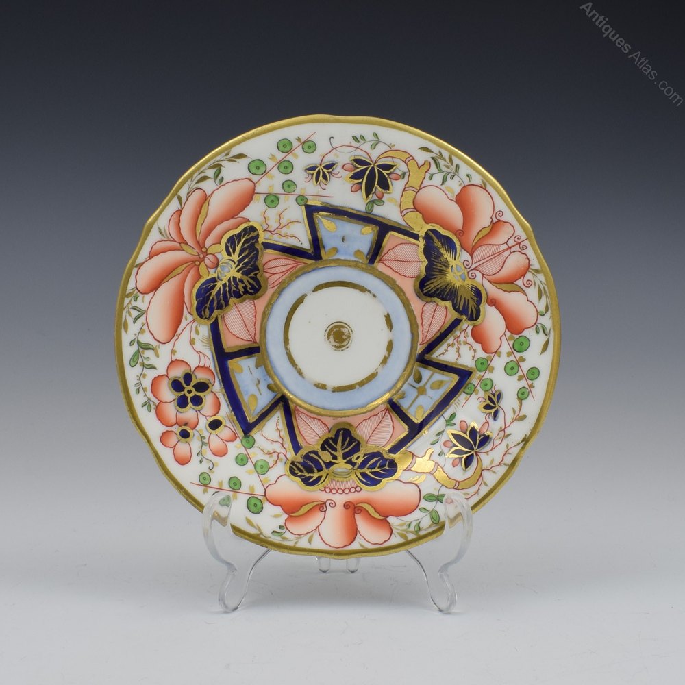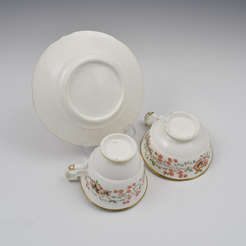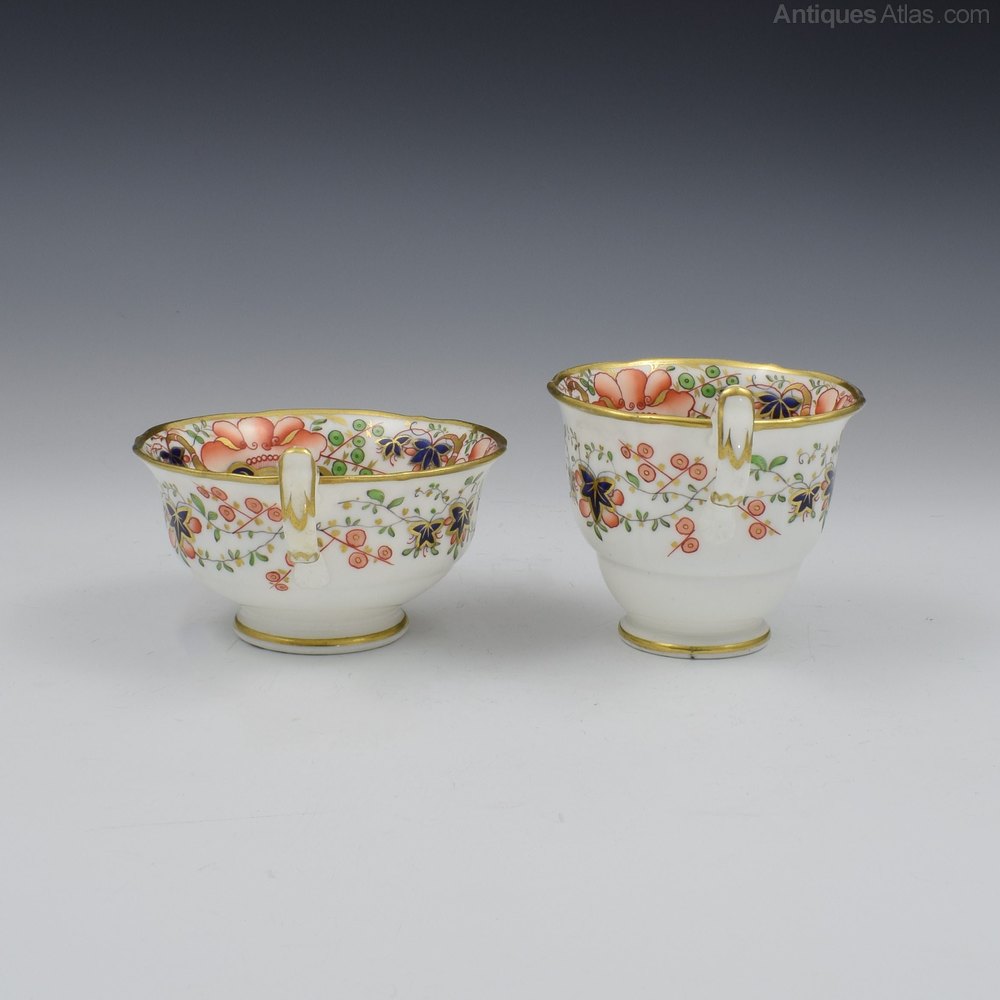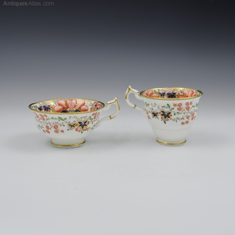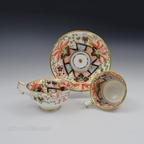 A lovely early Minton bone china tea and coffee trio in the "N" shape with slightly fluted, waisted shape with shaped rims and raised curved handle with unusual moulded paw shape lower terminals and splayed flower shape uppers. Finely painted in oriental style inside the cups and saucer with small areas of underglaze mazarine blue and enamels in a loose imari palette in orange shades, green and pale blue with lots of gilt ornamentation. The outside of the cups has elements of the inner pattern of flowering vines running as a frieze against the white ground. The coffee cup and saucer marked with pattern number 512 in gilt.Reference: A Compendium Of British Cups by Michael Berthoud, plates 757 and 758.