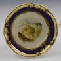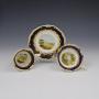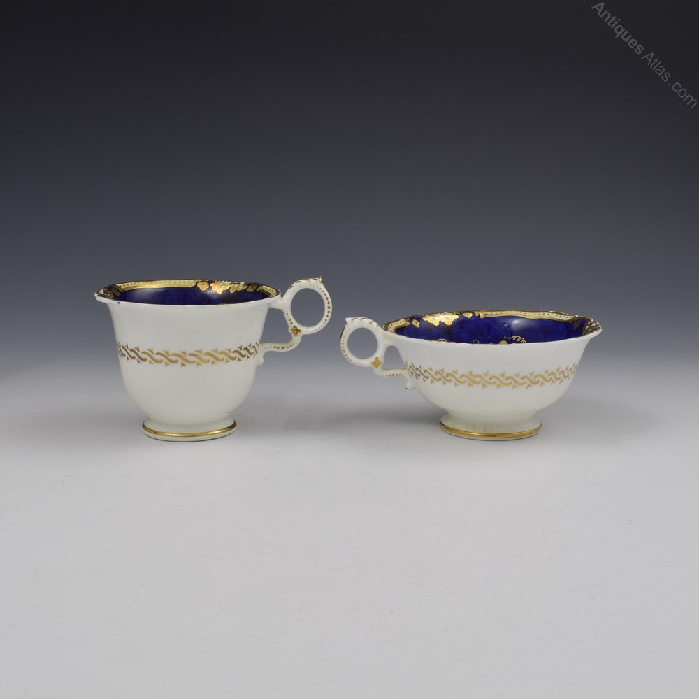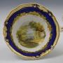 An attractive porcelain tea and coffee trio from the Grainger manufactory of Worcester in the Gloster shape with shaped rims with moulded flowers and raised dots and with distinctive ring handles with acanthus leaf thumb rest. A mazarine blue underglaze blue ground runs below the rims reserving white ground in the centres finely painted with various country landscapes. Gilt grape vines flow along the edge of the reserves and lemon yellow enamel and gilding decorate the rims and handles. The saucer and coffee cup marked underneath with pattern number 1933 in gilt. c.1835-1840.Reference: A Compendium Of British Cups, Michael Berthoud, plate 1059, and Grainger's Worcester Porcelain, Sandon & Sandon, plates 32, 33, 41 and 43.