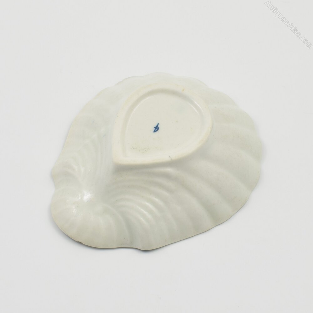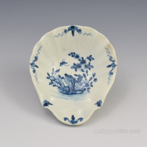 A lovely Worcester porcelain pickle dish, moulded as a scallop shell, finely painted in the two-peony rock bird pattern, c.1754-1760. Workman's mark to the base.It measures 11cm (4 3/8") by 9.3cm (3 5/8) wide and 2.8cm (1 1/8") high.