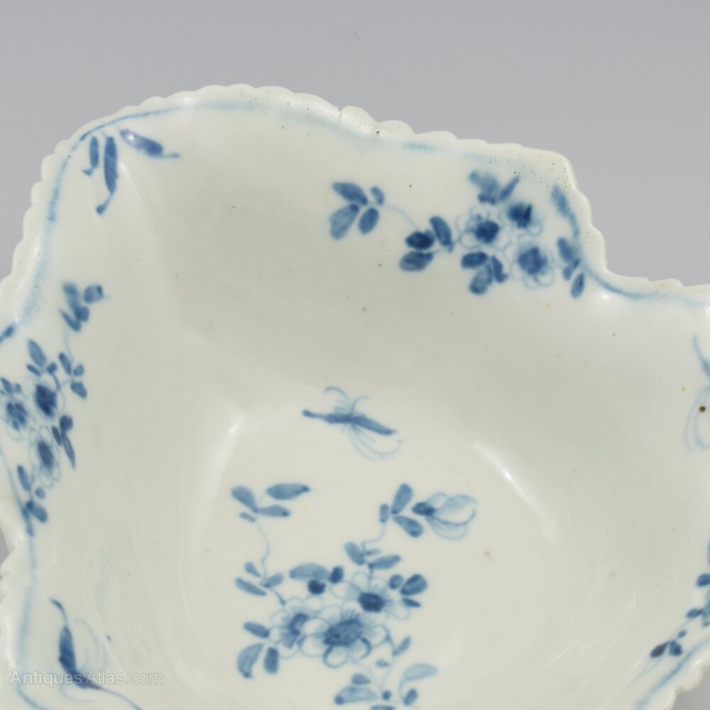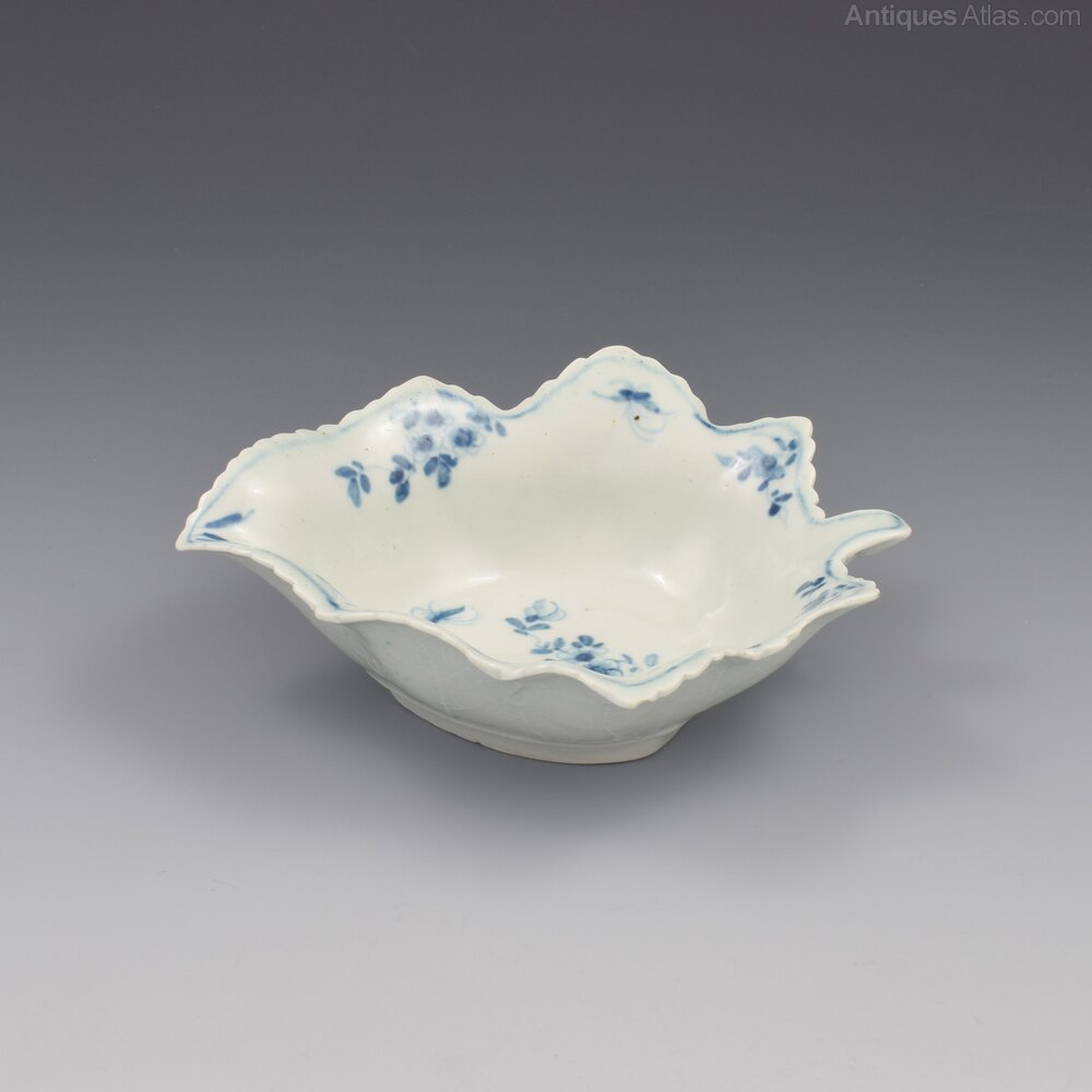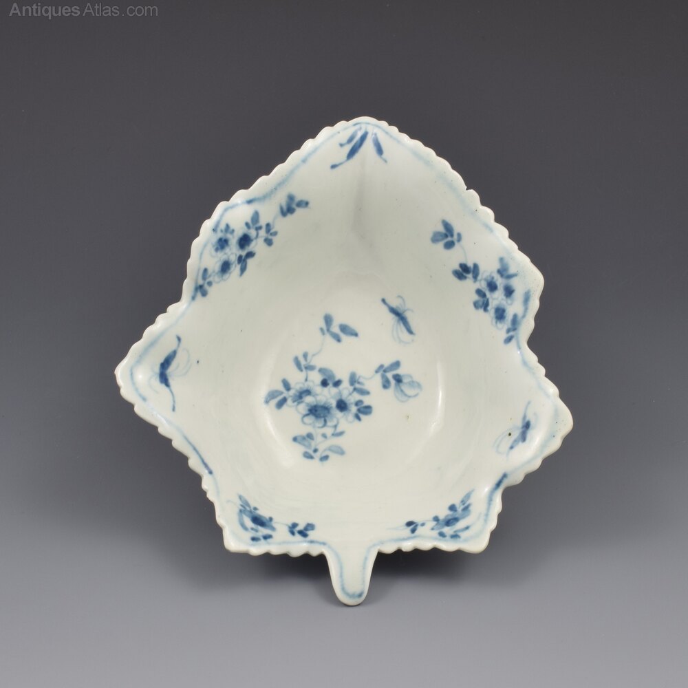 A stunning and rare, Worcester porcelain vine leaf shape pickle dish, delicately painted in underglaze blue in the "pickle leaf daisy" pattern. Of particularly large size, with deep walls, and shaped serrated edge. Finely modelled leaf veins and tendrils to the underside and marked with a workman's mark. c.1758-1765.Reference: Worcester Blue & White Porcelain, 1751-1790, Branyan, French & Sandon, section I.E.41, these dishes referred to as "leaf trays".