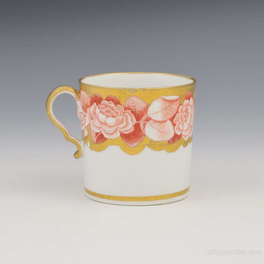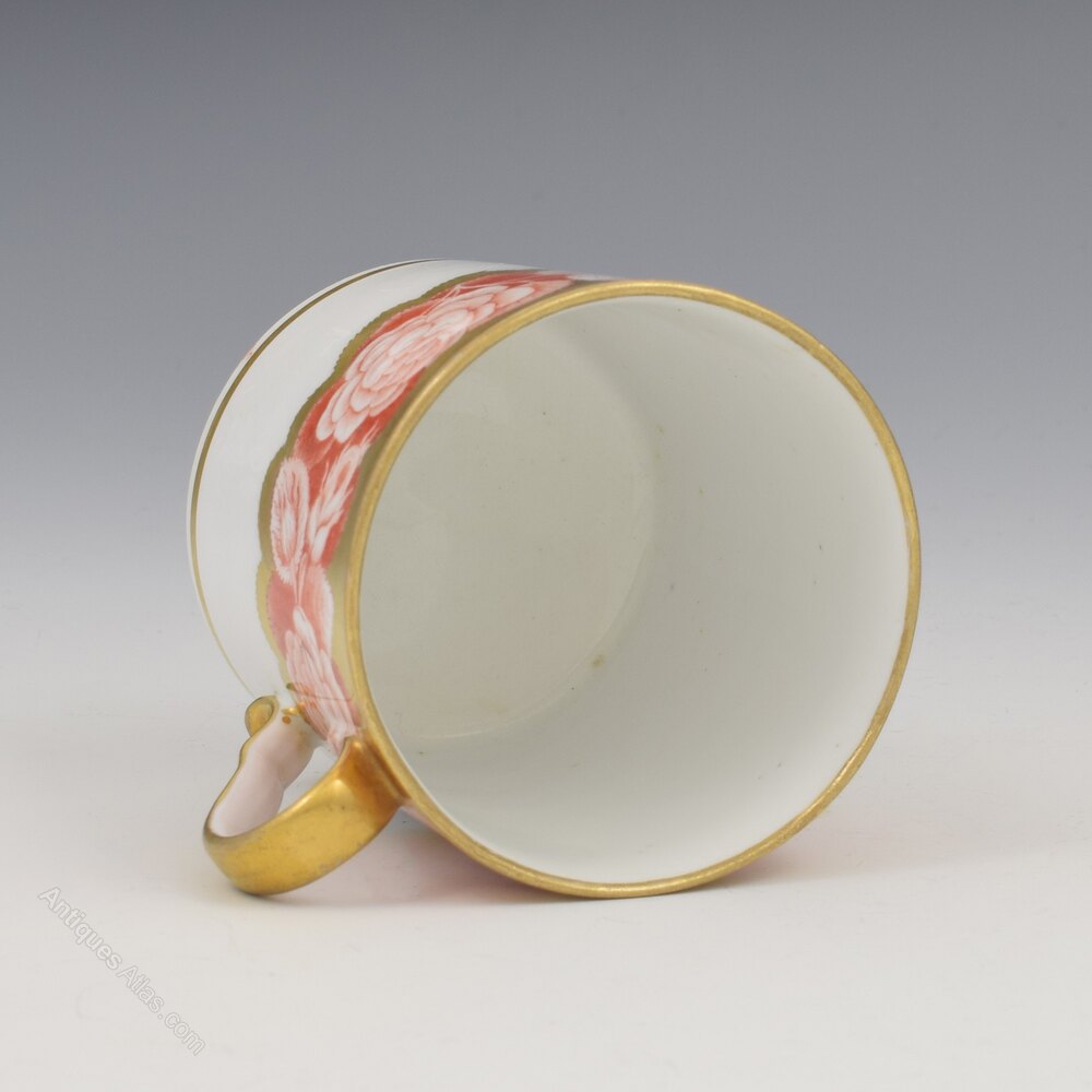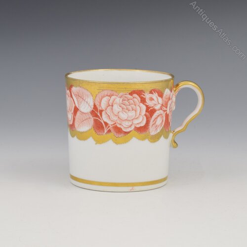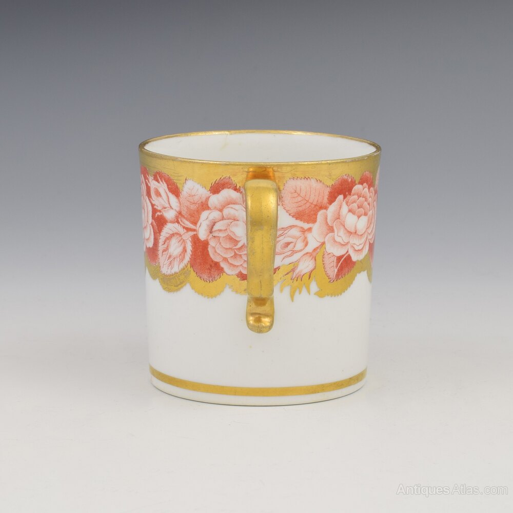 Fine Spode bone china porcelain coffee can with a rich burnt orange border pattern of roses, printed with a method known as "pluck & dust". Edged in thick gilding, with gilded handle, band above the foot, and rim. Unmarked but known pattern 984, c.1806.It measures 6.5cm (2 1/2") high, 8.5cm (3 3/8") rim to handle and 6.5cm (2 1/2") rim to rim.