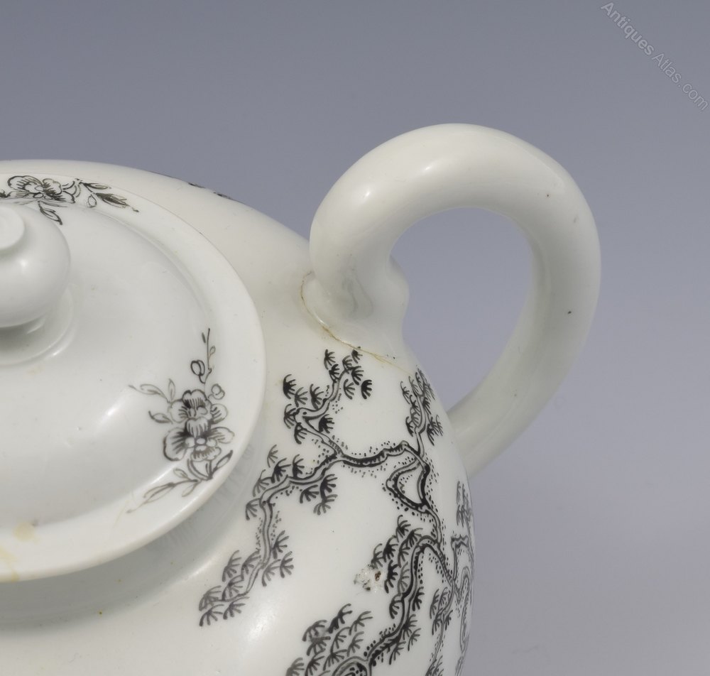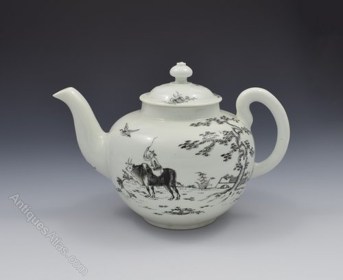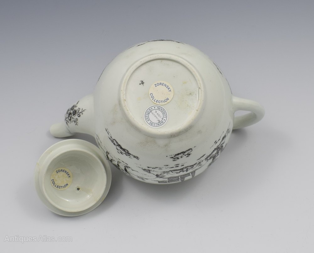 Very nice Worcester porcelain teapot painted in monochrome black with the boy on a buffalo pattern, c.1755-1765. Previously of the Zorensky collection with the collection stickers to both the base of the pot and inside the lid, and illustrated in Spero & Sandon plate 61 and sold in the Bonhams sale Part 1, lot 7. Marked to the base also.It measures 14cm (5 1/2") high, 19.7cm (7 3/4") spout to handle and 12.1cm (4 3/4") wide. Condition is very good: the cover has had a break restored but no other damage or restoration (condition as per Bonhams sale). Surface wear is very light. There are some small areas under the belly that show kiln dust spotting and there is a firing line around the top of the handle terminal.