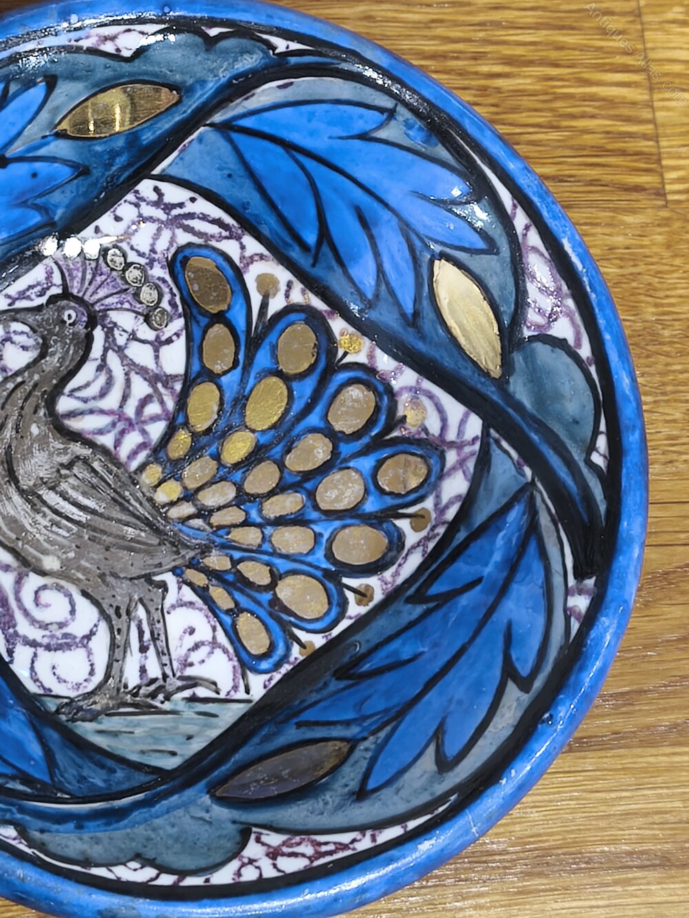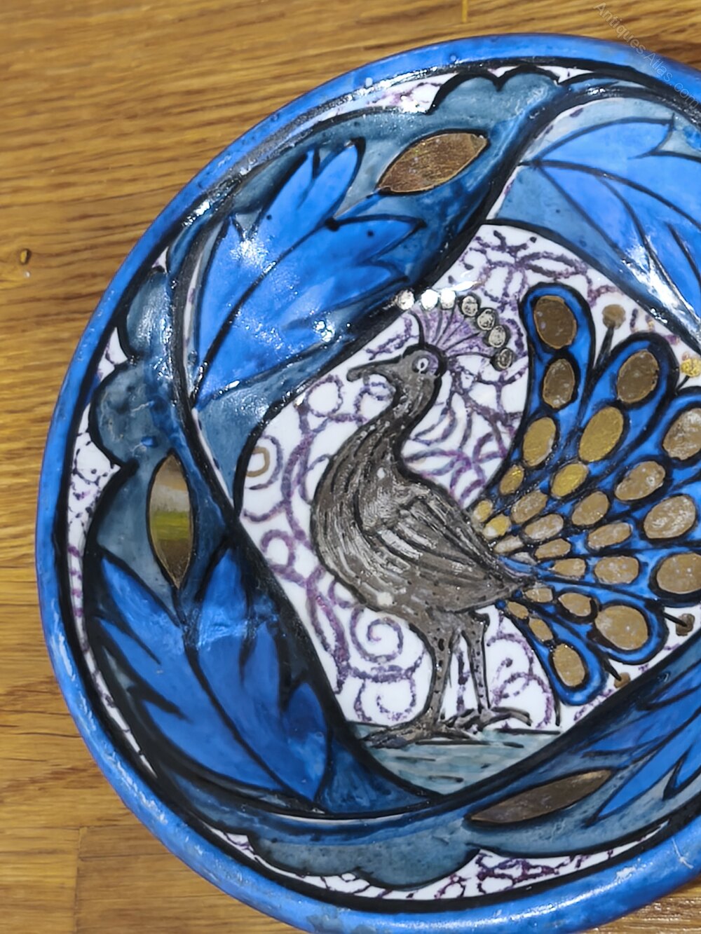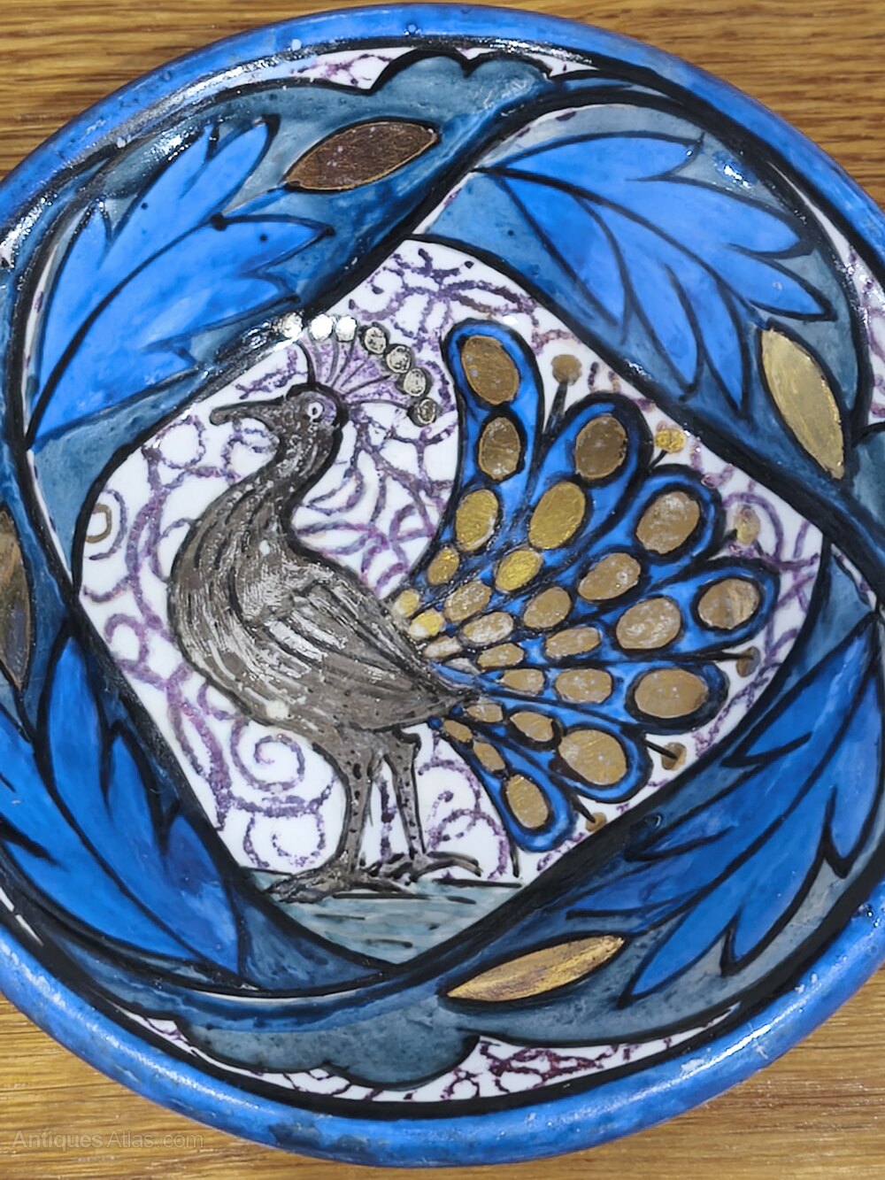 For sale today we have this Rare Double Lustred Dish by John Pearson of the Guid of Handicrafts and Newlyn Industrial Class. A beautiful piece of Arts and Crafts pottery, the dish features a hand painted Peacock with tail feathers on display, surrounded by flowing Blue foliage. The Peacock is picked out in Silver lustre, while the feathers (and the buds in the foliage) are Gold. The base is decorated with a blooming flower, along with John Pearson's monogram. Pearson was trained in ceramics by William De Morgan, and that is very evident in this piece.We are experienced dealers in mid to high end ceramics, metalware and other items. We give honest, accurate descriptions and provide high quality photographs. Please feel free to contact us regarding any item that may be of interest to you or if you need further information.