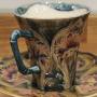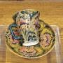 For sale today we have this exquisite coffee cup and saucer, by William Moorcroft, in the revived cornflower pattern. Beautifully decorated with panels of blooming chrysanthemum flowers, framed in borders of their own foliage and coloured to the desirable ochre colourway. Circa 1912.Both pieces signed "W Moorcroft" and in super condition.
