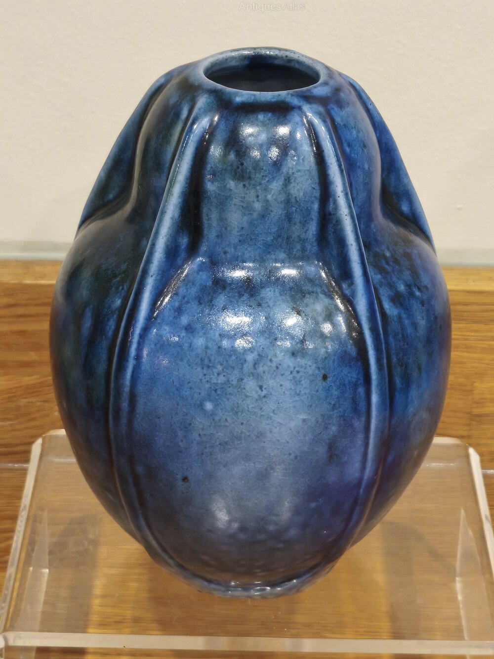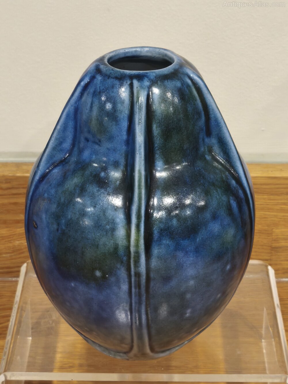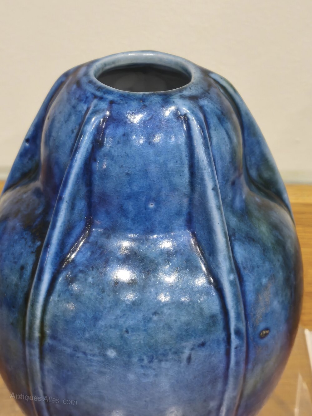 For sale today we have this superb vase by Edward and Walter Martin for the Martin Brothers pottery. Of gourd form, with 5 fins/ ridges to the sides and glazed to a varying, mottled blue. A striking and very tactile piece.6 1/2" tall x 4" dia. Marked "Martinware, Southall" to the base as shown.