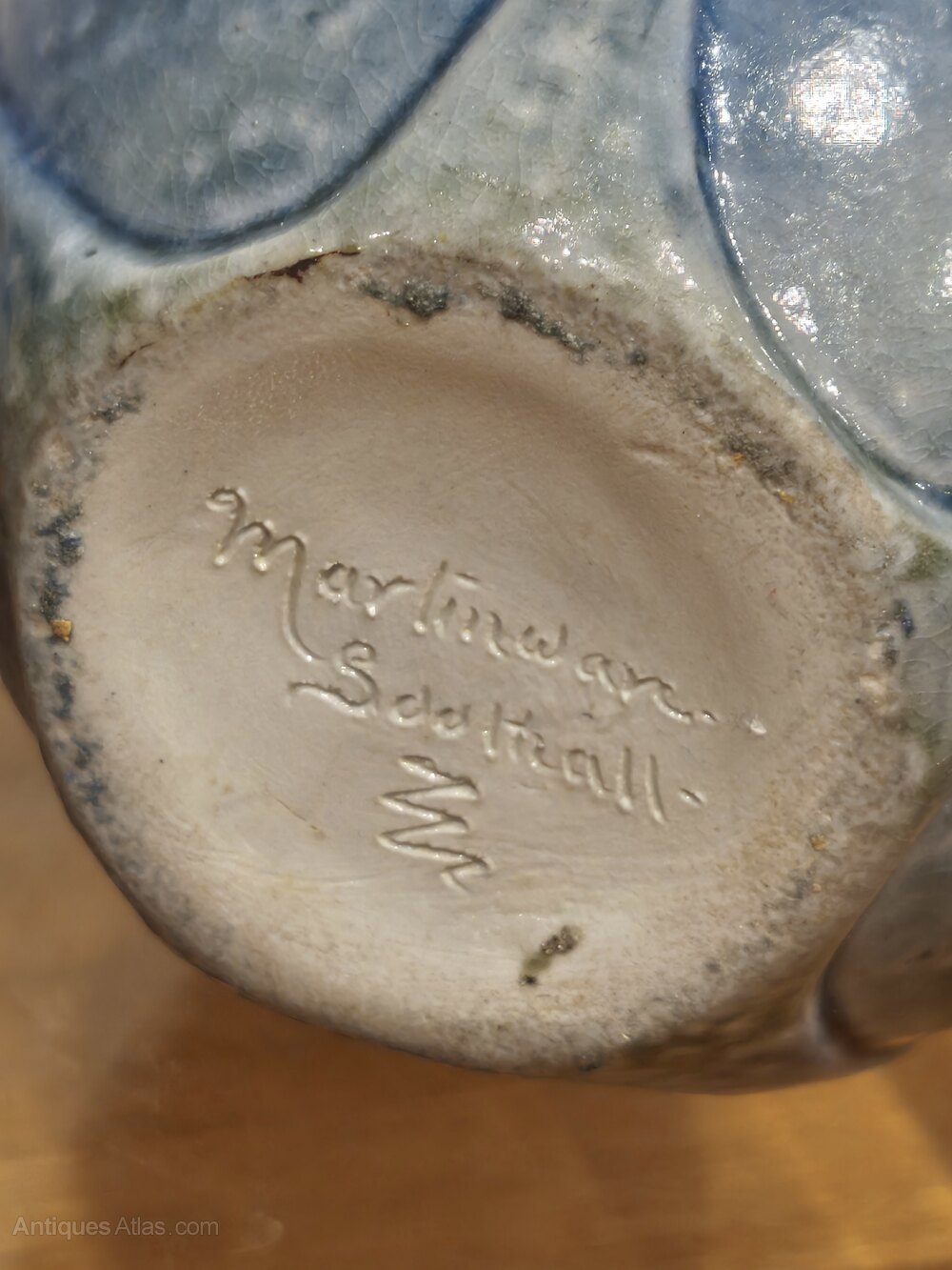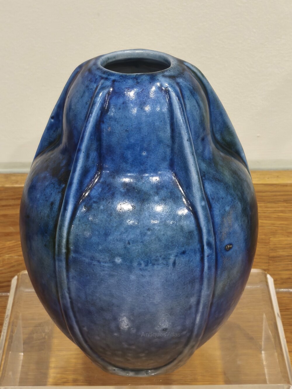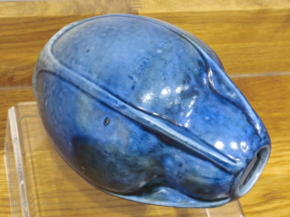 For sale today we have this superb vase by Edward and Walter Martin for the Martin Brothers pottery. Of gourd form, with 5 fins/ ridges to the sides and glazed to a varying, mottled blue. A striking and very tactile piece.6 1/2" tall x 4" dia. Marked "Martinware, Southall" to the base as shown.