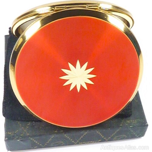 Such an eye-catching vintage Stratton powder compact!This beautiful unused 1960s Stratton powder compact is adorned with gorgeous red and gold enamel.