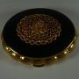 A beautiful vintage Kigu Concerto musical powder box which plays very well.Kigu Ltd. describe this model in their 1968 catalogue as-"77-21 MJ Filigree jewel mount in gilt decorates the jet black enamel top of gilt musical."
