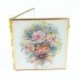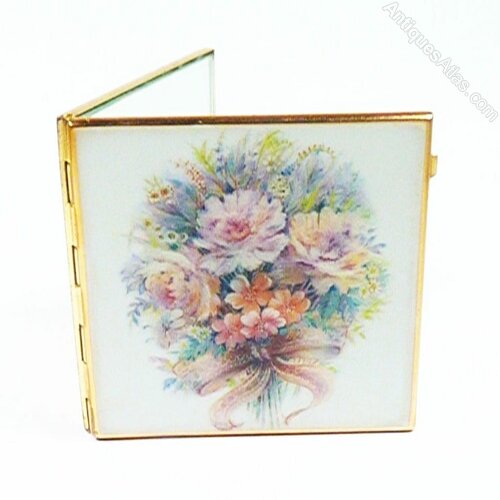 A petite and slender Stratton double mirror handbag mirror compact.The lid is decorated with a delightful bouquet.