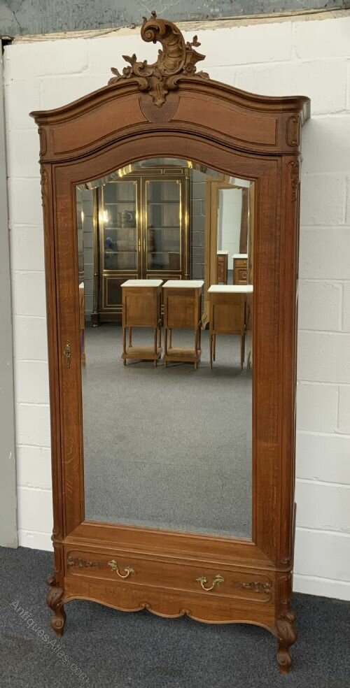 This lovely carved oak french armoire is offered in very good condition.The armoire has a large original bevelled mirrored door with a working lock and key.