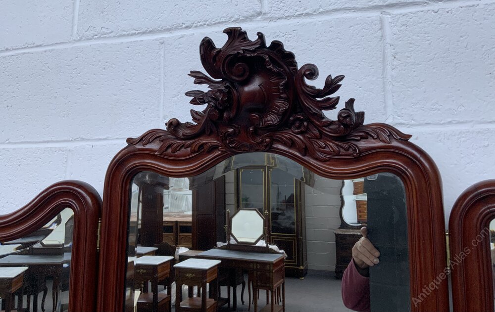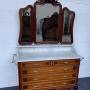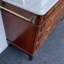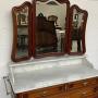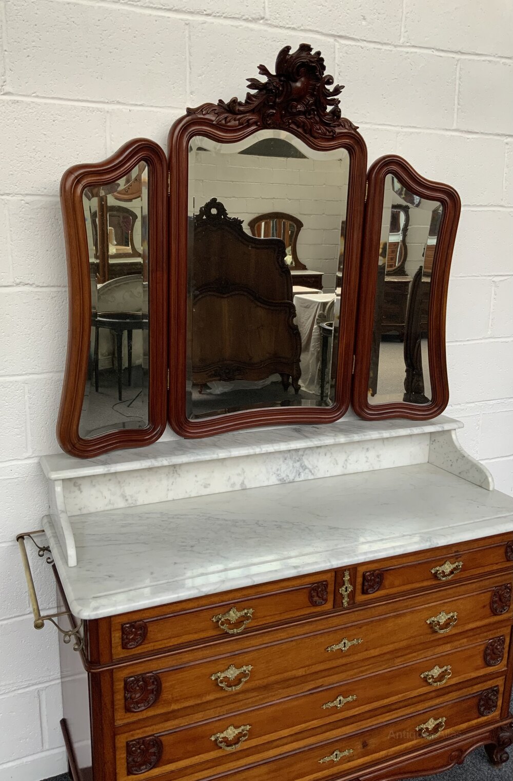 This lovely French mahogany dressing table is offered in very good condition.The dressing table has three framed bevelled mirrors above a carrera marble top. The base has two drawers above three full length drawers.