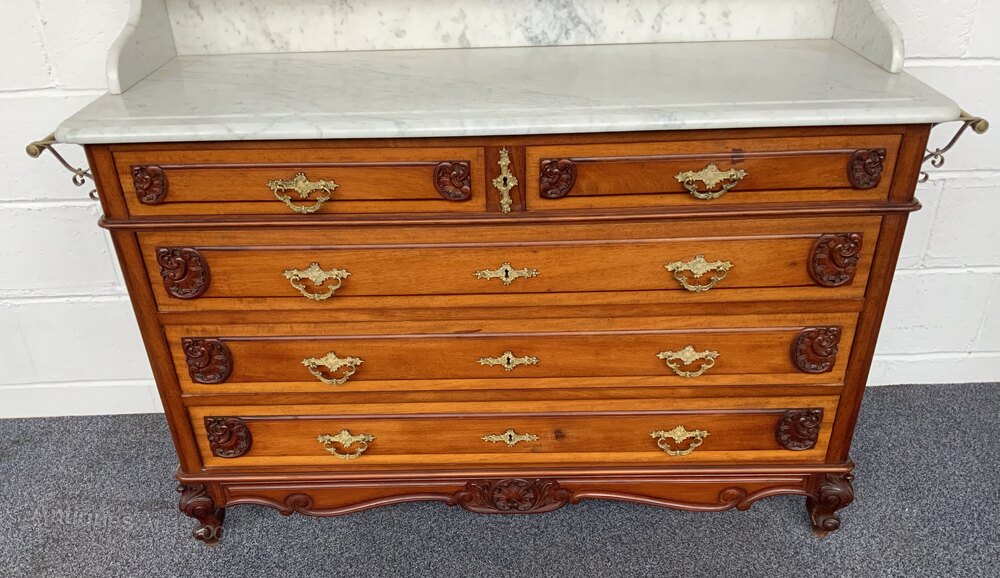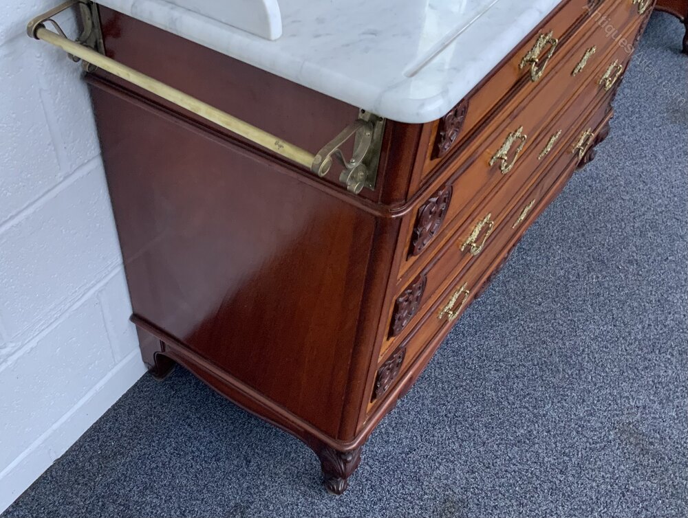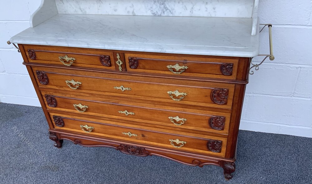 The dressing table retains its original brass handles and escutcheons and has two brass towel rails.