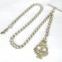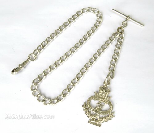 Antique silver watch chain and military fob.The chain measures 33cm long including the T-bar and the clasp. The T-bar and clasp are hallmarked for 1917, with a maker’s mark for Herbert Bushell & Son of Birmingham. Each of the links has the lion silver mark.