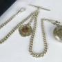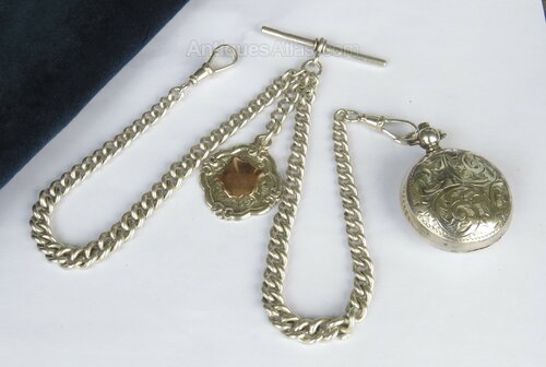 Antique silver double watch chain and sovereign holder.The T-bar is hallmarked for 1923. Each of the links has the lion has silver mark. The clasps appear to be period replacements. Each length of chain measures 20cm long including the T-bar and the clasp, overall length clasp to clasp is 38cm.