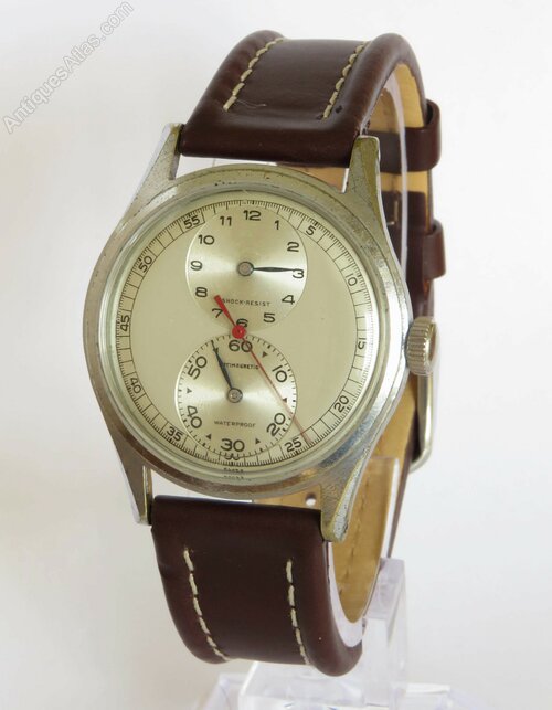 The dial is in good original condition with original blued steel hands to the subsidiary dials and original red seconds hand. The dial has been left blank so that the original watch company could add their details… signed examples of this watch can be found from Girard Perregaux, Ernest Borel and Cyma.