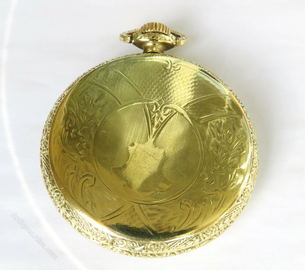 The watch measures 44mm diameter excluding the winding stem and the loop. The case is gold filled and was made by the Illinois Watch Case Company. The case is nicely decorated. A little unevenness to the screw-on case back but not too serious.