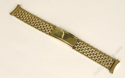 Montal rolled gold beads of rice watch bracelet, 18mm.The bracelet is adjustable, measuring between just under 15cm, going up to 16cm (plus the watch). It has two options for the end pieces, either curved or straight depending on the watch head. The bracelet is rolled gold and it is in good condition, just a few light short scratches and a little unevenness to the clasp but not too detrimental at all.