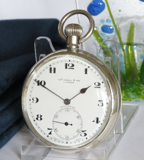 Silver Thomas Russell pocket watch, 1937The watch has a 17-jewel stem-winding movement which is working nicely. This is a good quality movement with swan neck regulator, screw set jewels and adjusted in three positions.