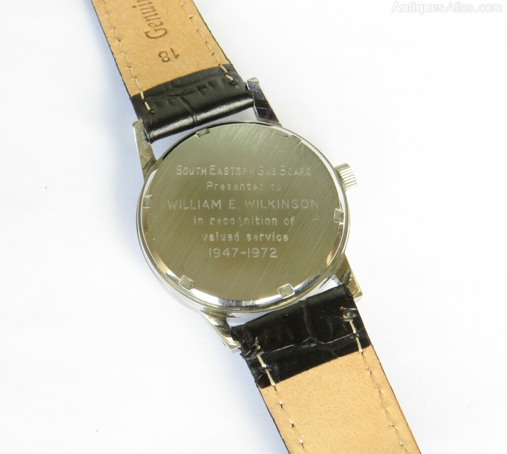 The watch measures 33mm diameter excluding the winding crown and the lugs. The case is stainless steel and it is in lovely condition, just some short surface scratches to the back but not too serious. The back of the watch has a 1972 long service inscription.