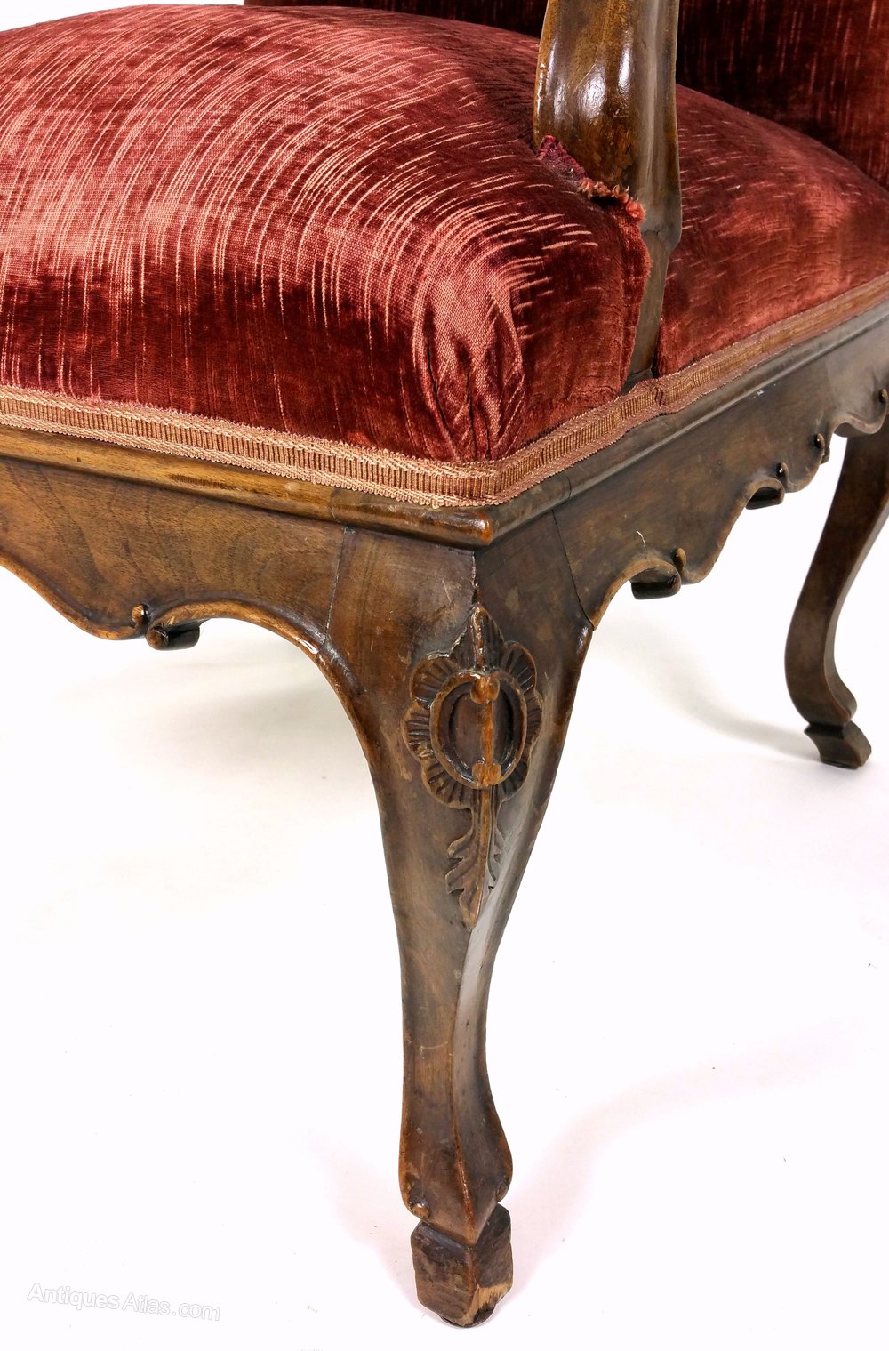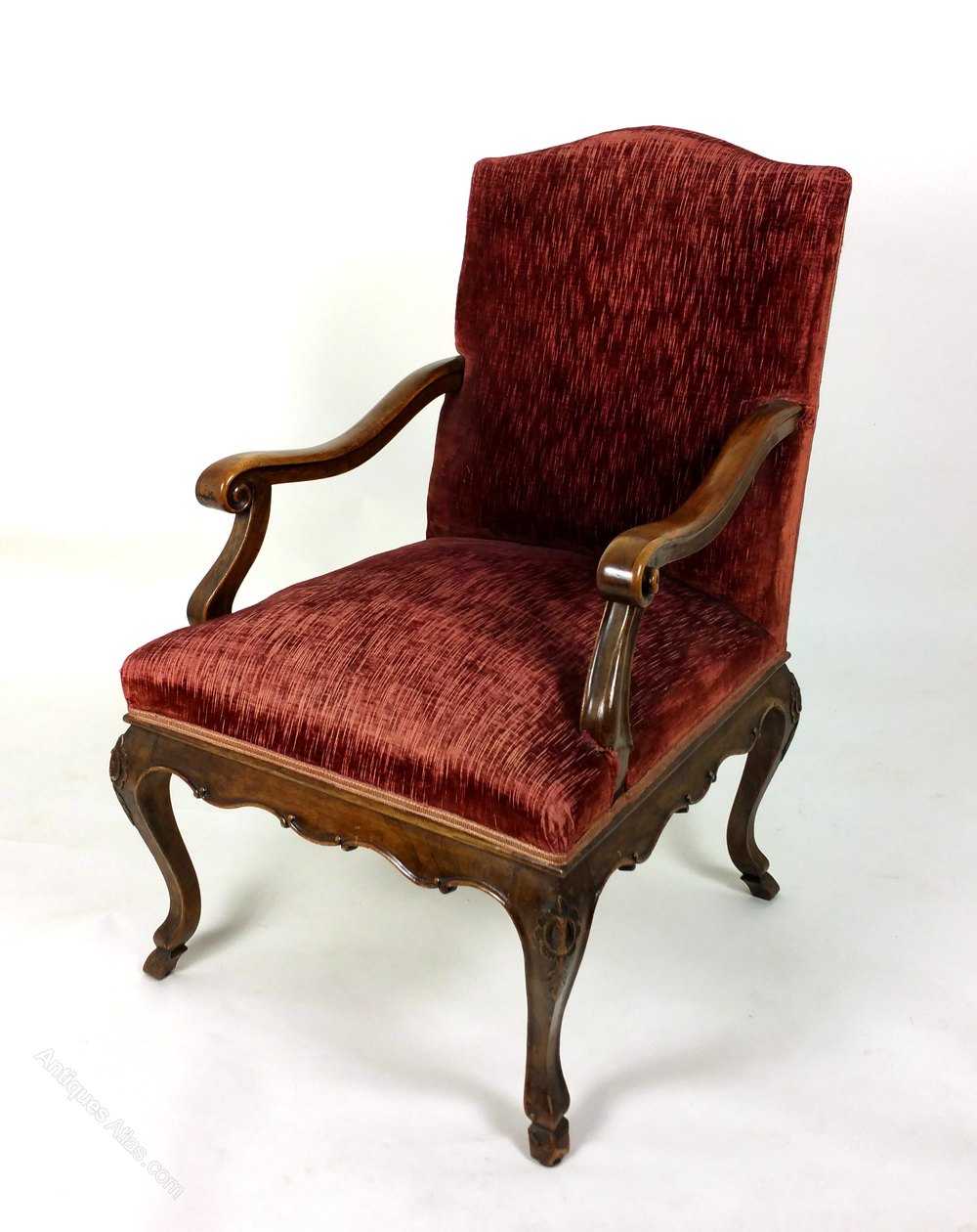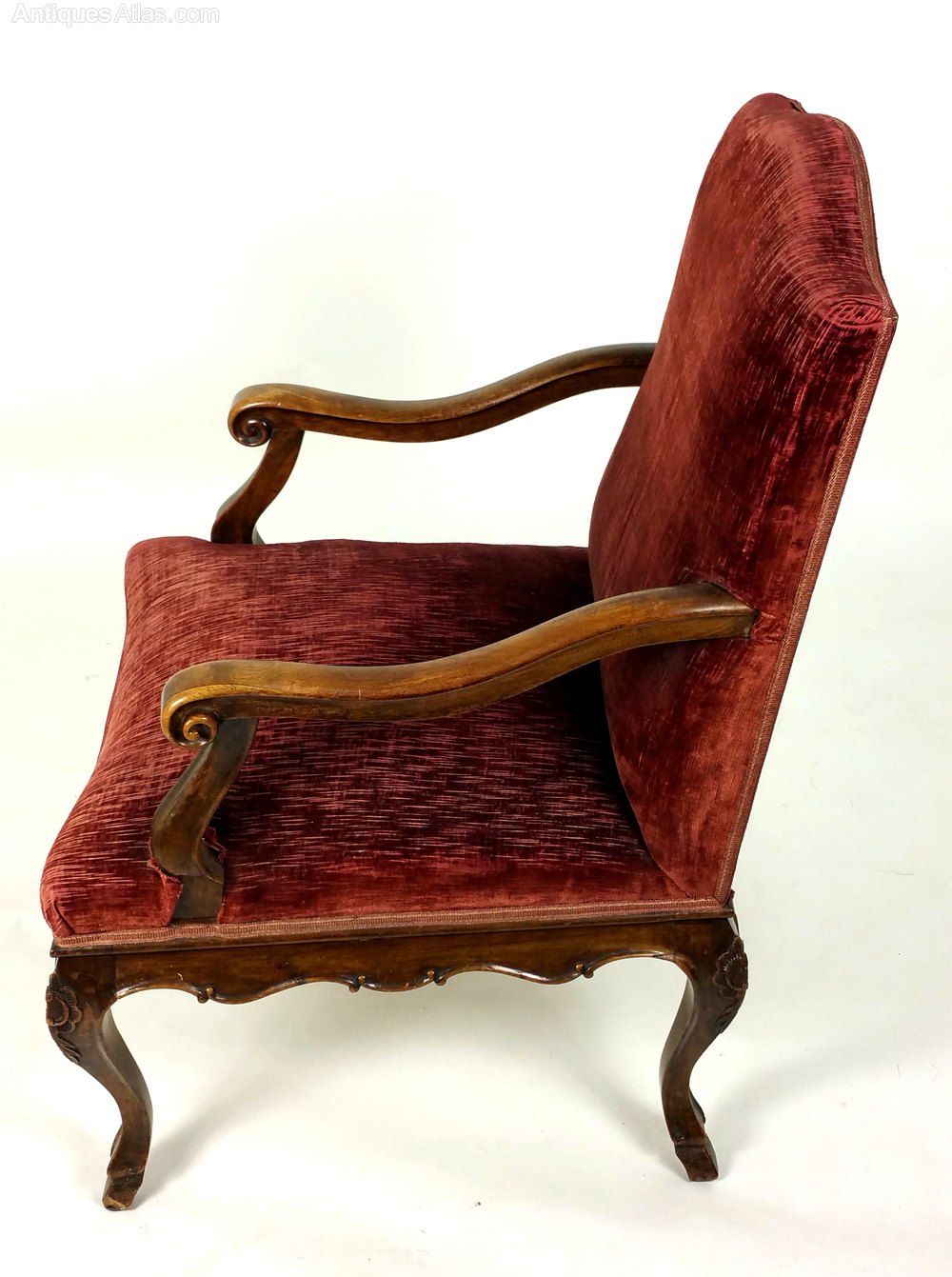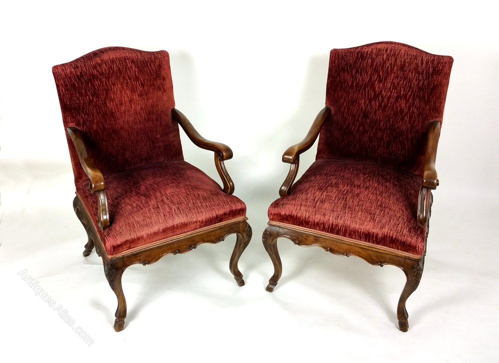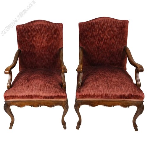 These beautiful large French solid walnut elbow chairs have shaped and scrolled arms, a carved frieze and stand on carved cabriole legs with hoof feet. The back and seat are upholstered in deep red velvet woven fabric. Each chair measures 25 ¼ in – 64.2 cm wide, 27 in – 68.6 cm deep and 39 in – 99 cm in height with a seat height of 20 ½ in - 52 cm. These chairs would make an ideal feature or decorator’s piece in a wide range of styles and settings.Thomas Crabb Antiques was founded in 1979 and is run by Stephen Roy Thomas.