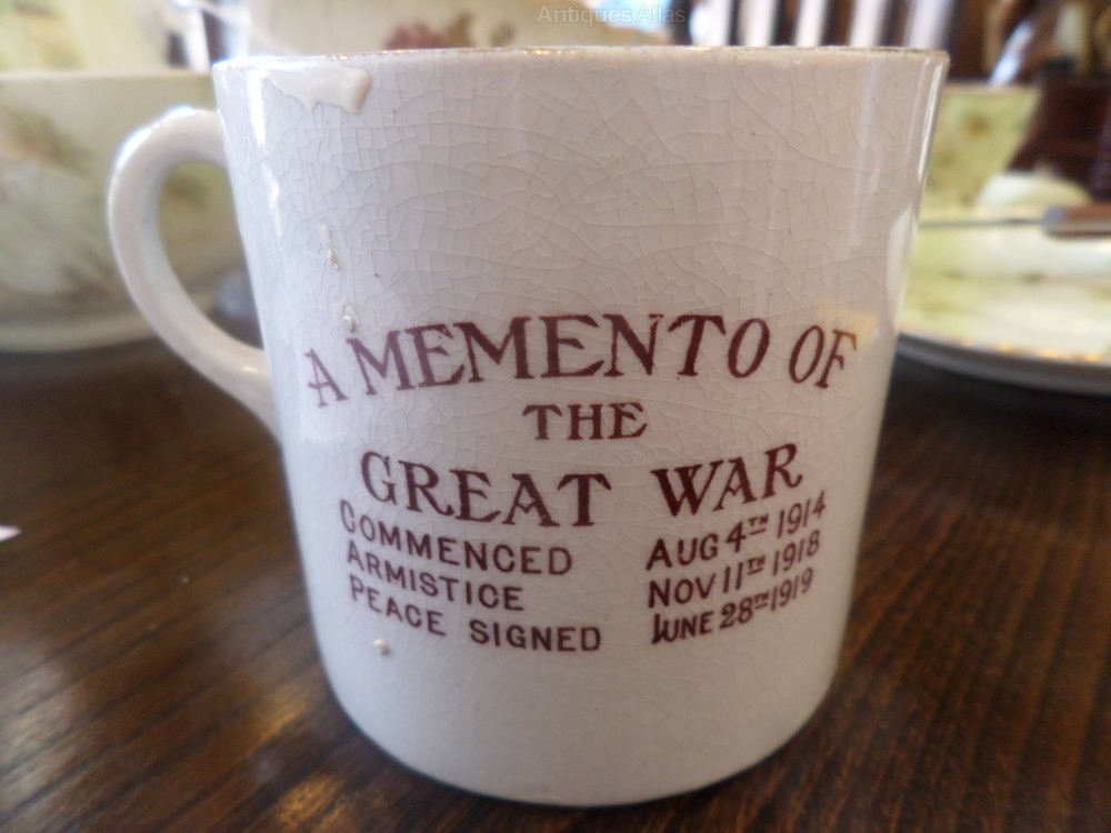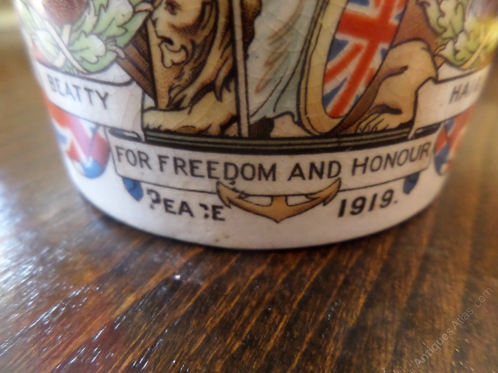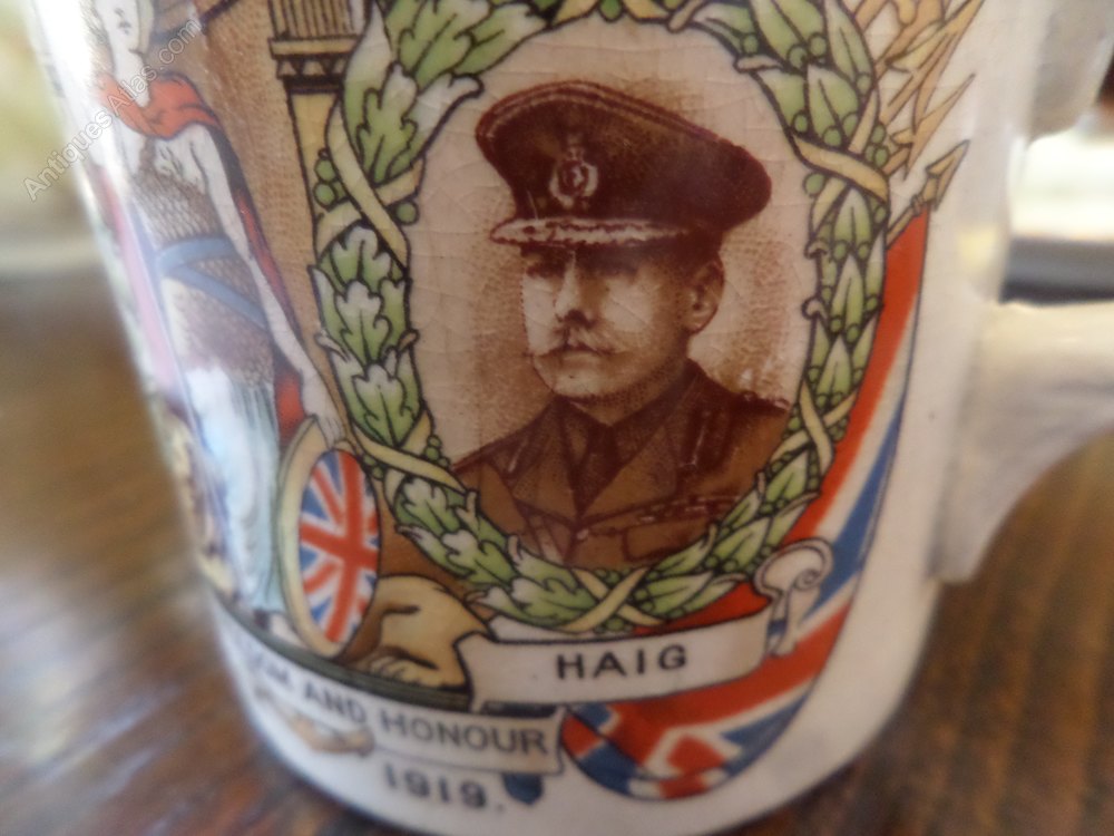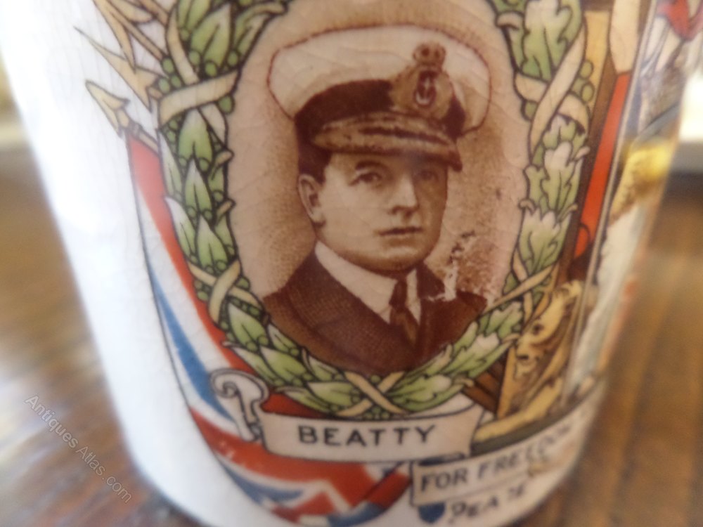 A very splendid Commemorative Mug of the Great War. Depicting the Dates and Photographs of Beatty and Haigh. Lovely decoration. This is a rare one!After 40 years in Antiques. Failing health means closure. ALL STOCK MUST GO. Up to 50% discount, BUY NOW!
