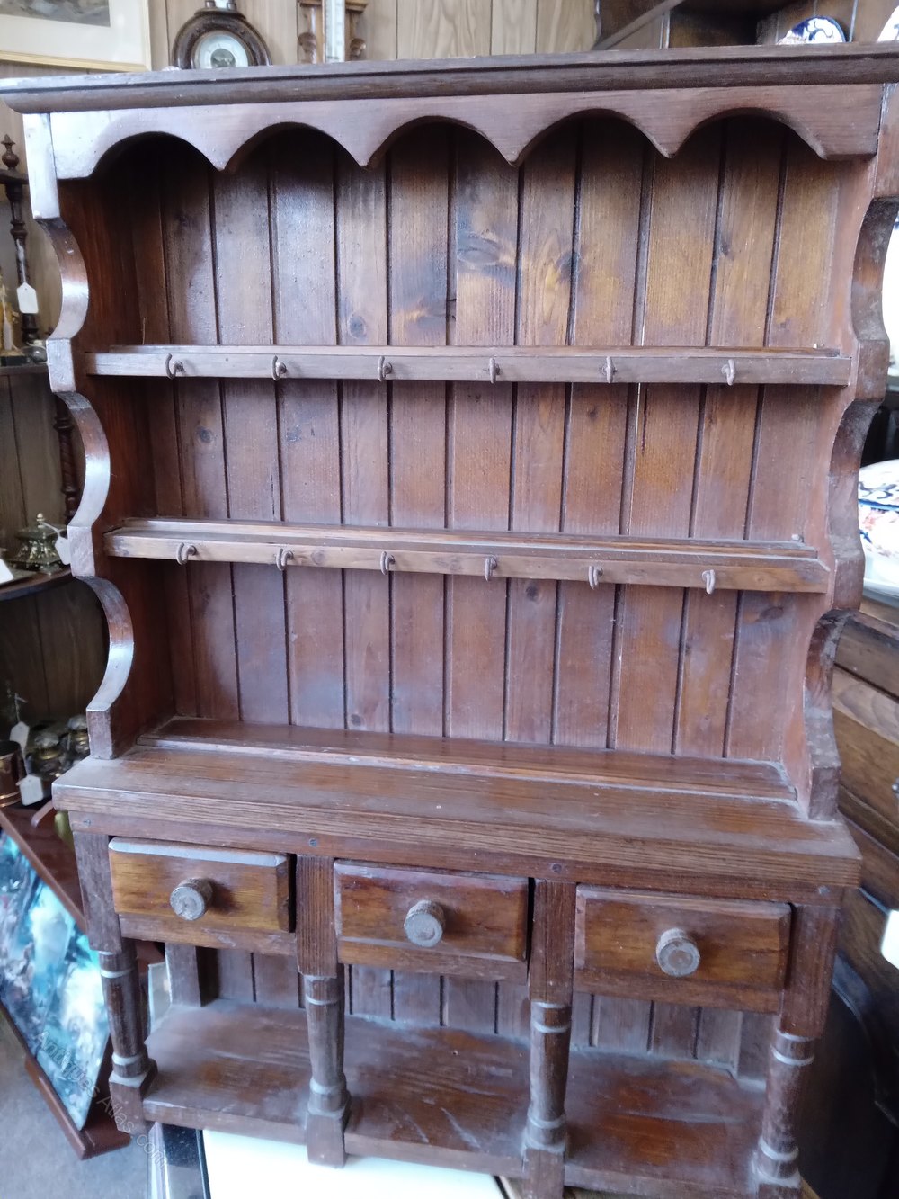 What a lovely miniature piece of Furniture. A Pine Dresser which has cup Hooks already and a Plate Rack. Turned Columns which give to an Open Base, above that are 3 Drawers. All in all a 'Charming Item' which measures Height 54.5cm Width 38.5cm and Depth 10cm. I have (May 14th) just given it another coat of Beeswax Polish--it is looking better then the Photos now!After 40 years in Antiques. Failing health means closure. ALL STOCK MUST GO. Up to 50% discount, BUY NOW!