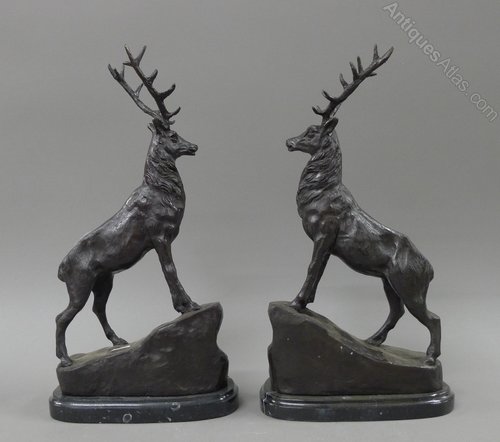 Here are a very nice Pair of Bronze Stages on Marbleised Bases. The Stages are on an outcrop viewing whatever might be in front of them!They are quite heavy for their size. The measure 42cm in height and the Bases are 24cm in length and 15.5cm in width. A Nice Pair