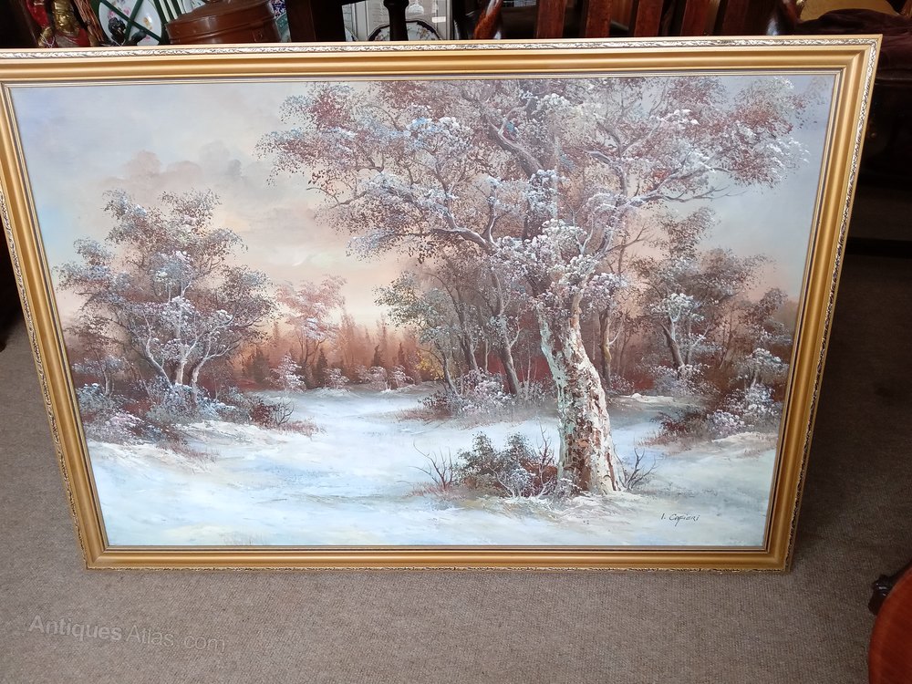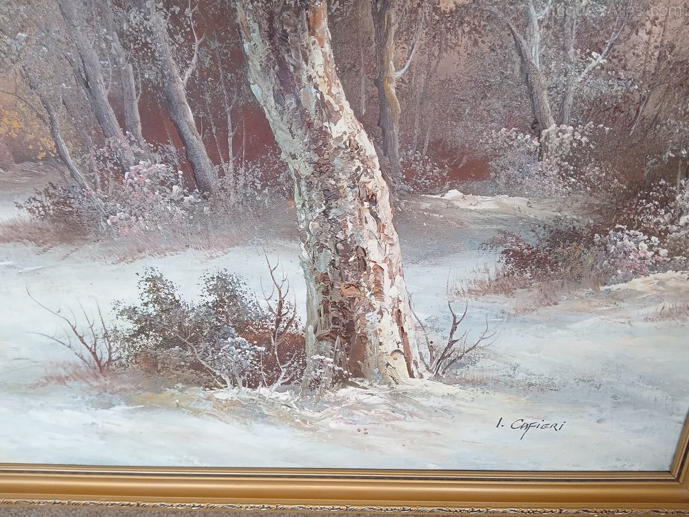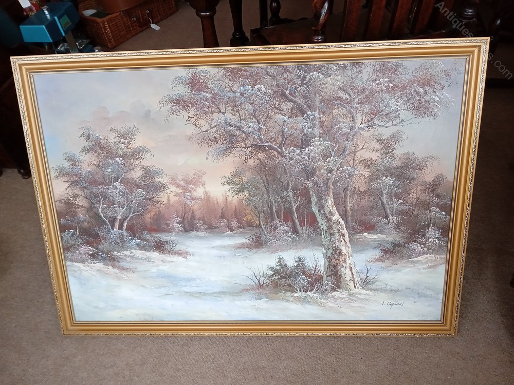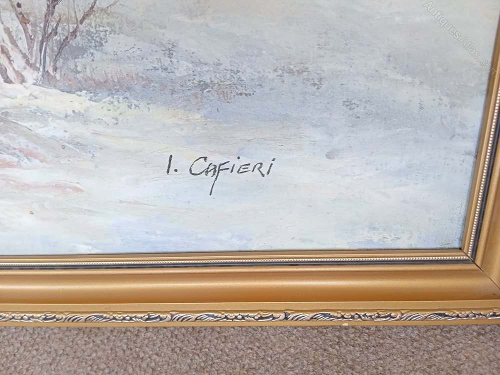 This is a lovely 'Snowtime' Painting---an Oil on Canvas which is large measuring 97.5cm in length and 67.25 in width.This is a delightful Painting by I.Cafieri.
