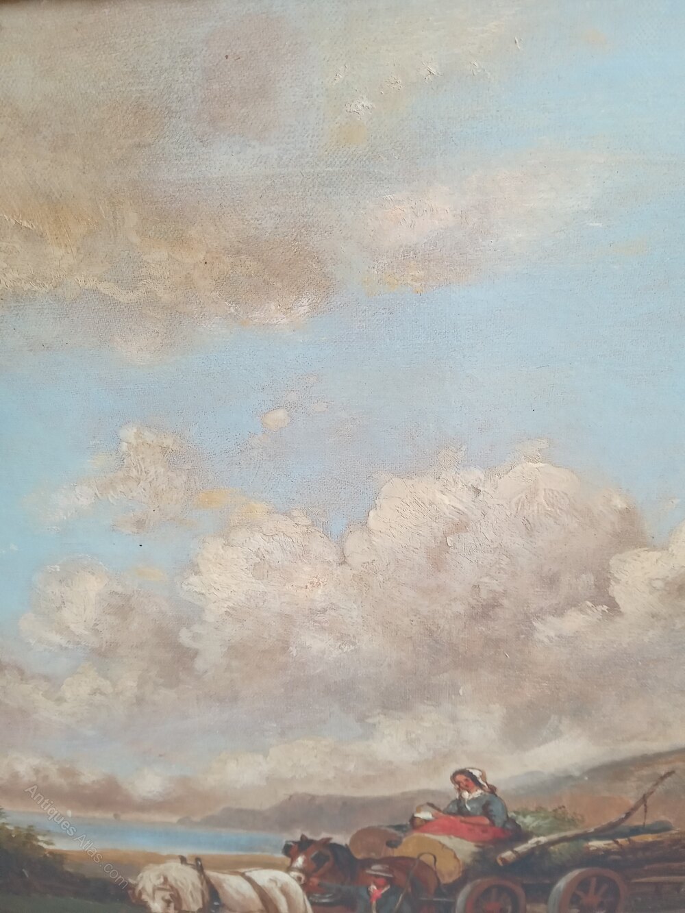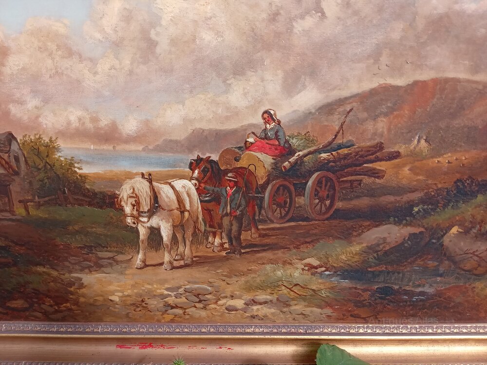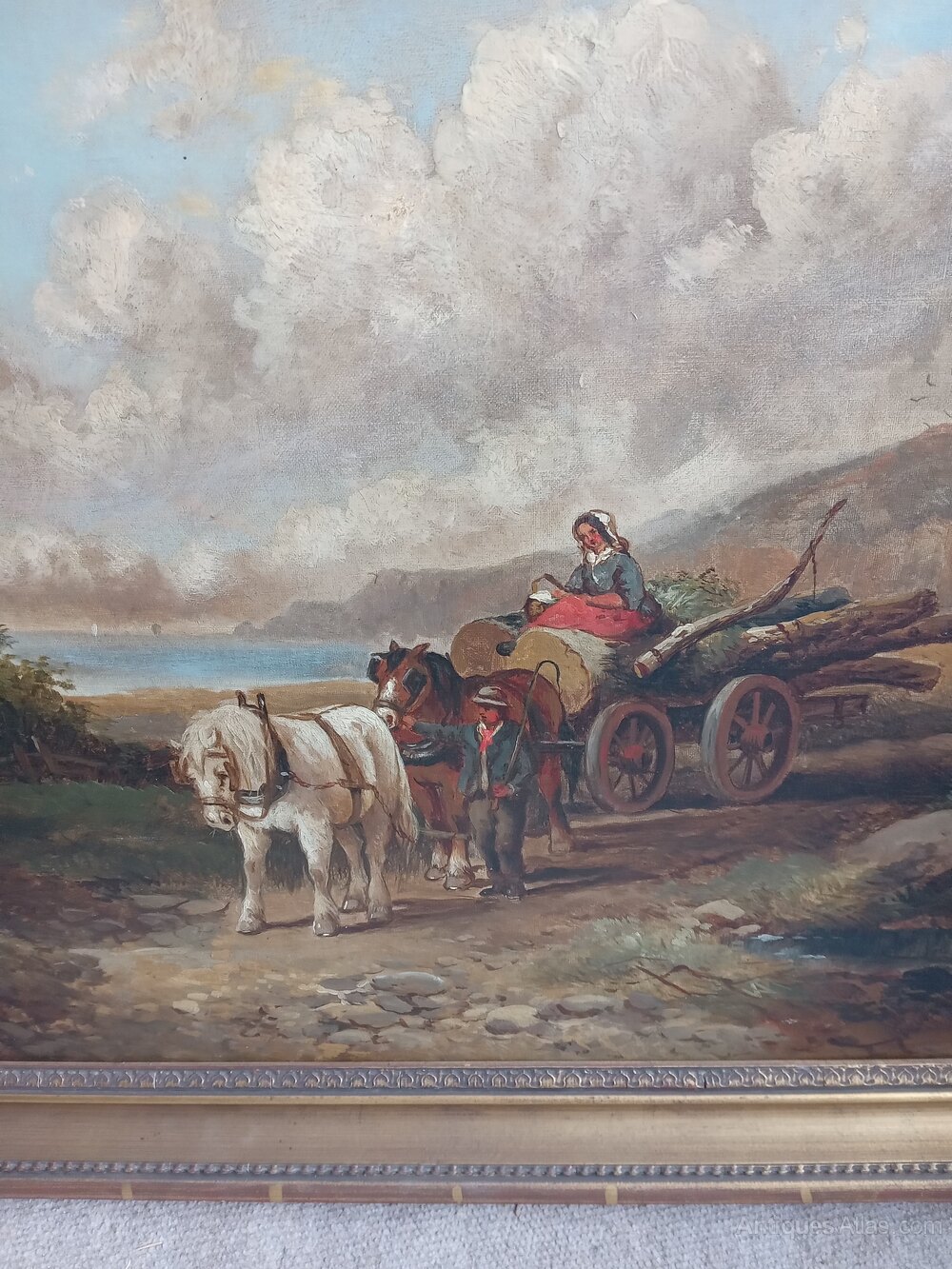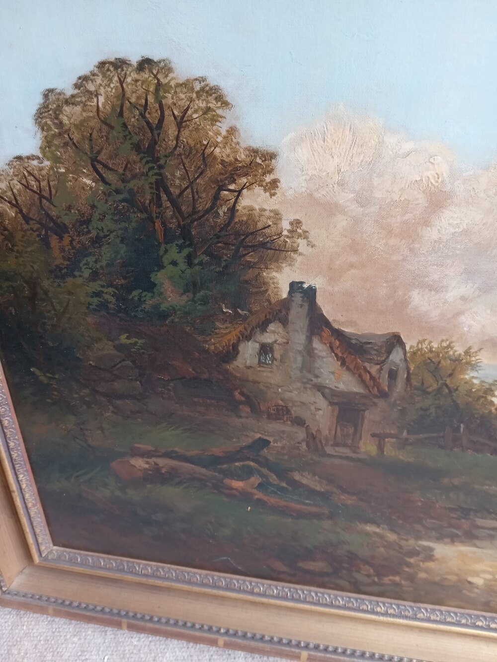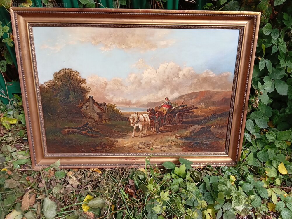 Here is a delightful Oil Painting on Canvas ranging from the Late Victorian era c1890. It is a very Large painting, measuring in Length 103cm and in height 73.5cm. It depicts a couple collecting Logs for their home and the have stopped to collect the logs at the side of the road by the Cottage. It has a Title--'BRINGING THE LOGS HOME' The Artist's signature is not displayed but well may by under the mounting and frame. On this item I am Offering FREE DELIVERY IN THE UK!After 40 years in Antiques. Failing health means closure. ALL STOCK MUST GO. Up to 50% discount, BUY NOW!