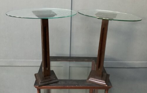 Pair of vintage 1920s oak Shop window display cabinets. Each Pillar stand consist of Corinthian style columns on stepped bases. Each Stand comes with an oval glass shelf that sits on the top of the stand to display numerous items in a shop window however, this pair of stands could serve just as well in a commercial setting display flowers or ornaments. They are a super pair and colour.